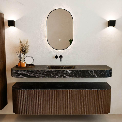 MONDIAZ THOR-DLUX 160cm meuble de salle de bains arrondi gauche + droite couleur Walnut avec 1 tiroir et 2 portes. Vasque suspendue CLOUD Milieu sans trou de robinet couleur Lava.
