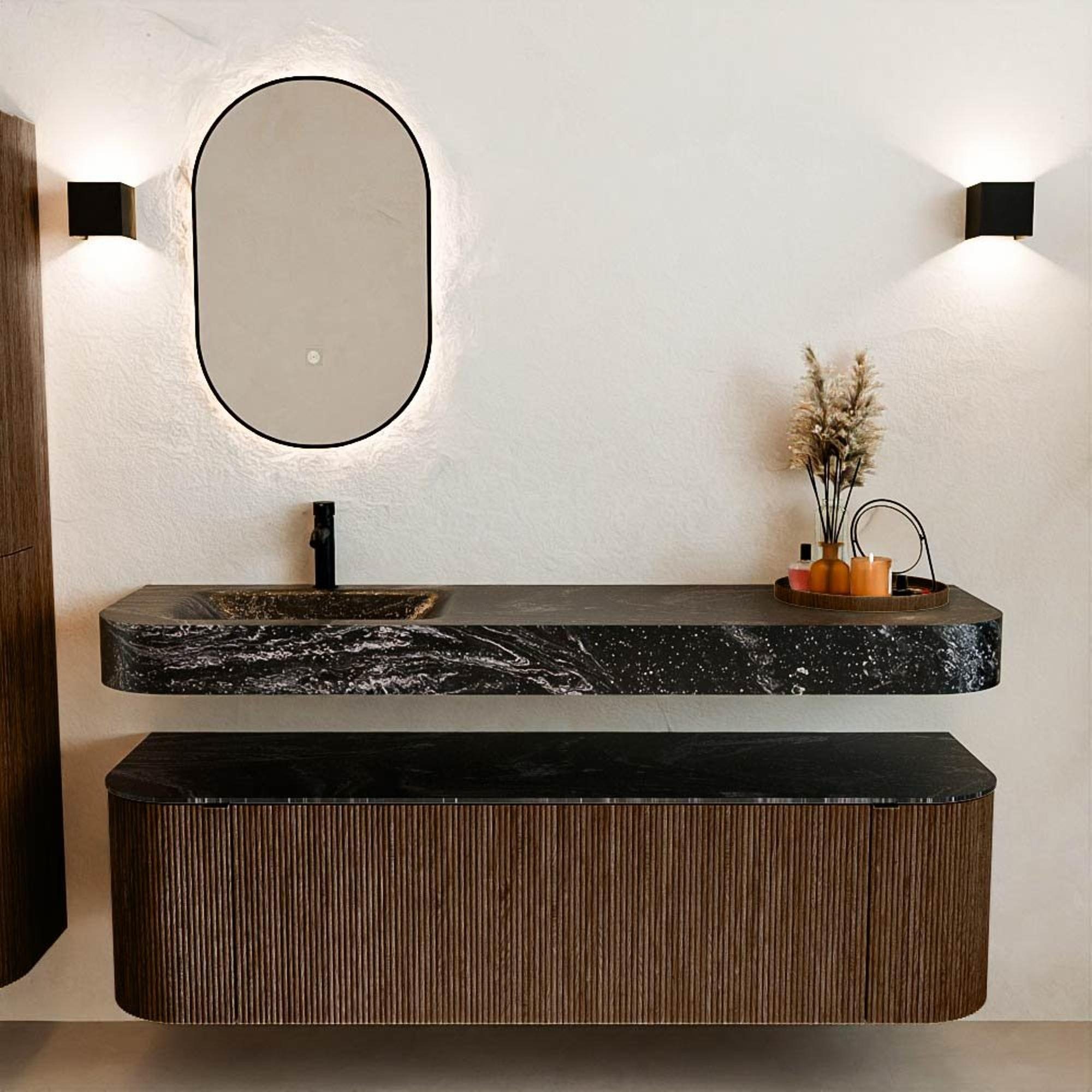 MONDIAZ THOR-DLUX 160cm meuble de salle de bains arrondi gauche + droite couleur Walnut avec 1 tiroir et 2 portes. Vasque suspendue CLOUD gauche 1 trou de robinet couleur Lava.