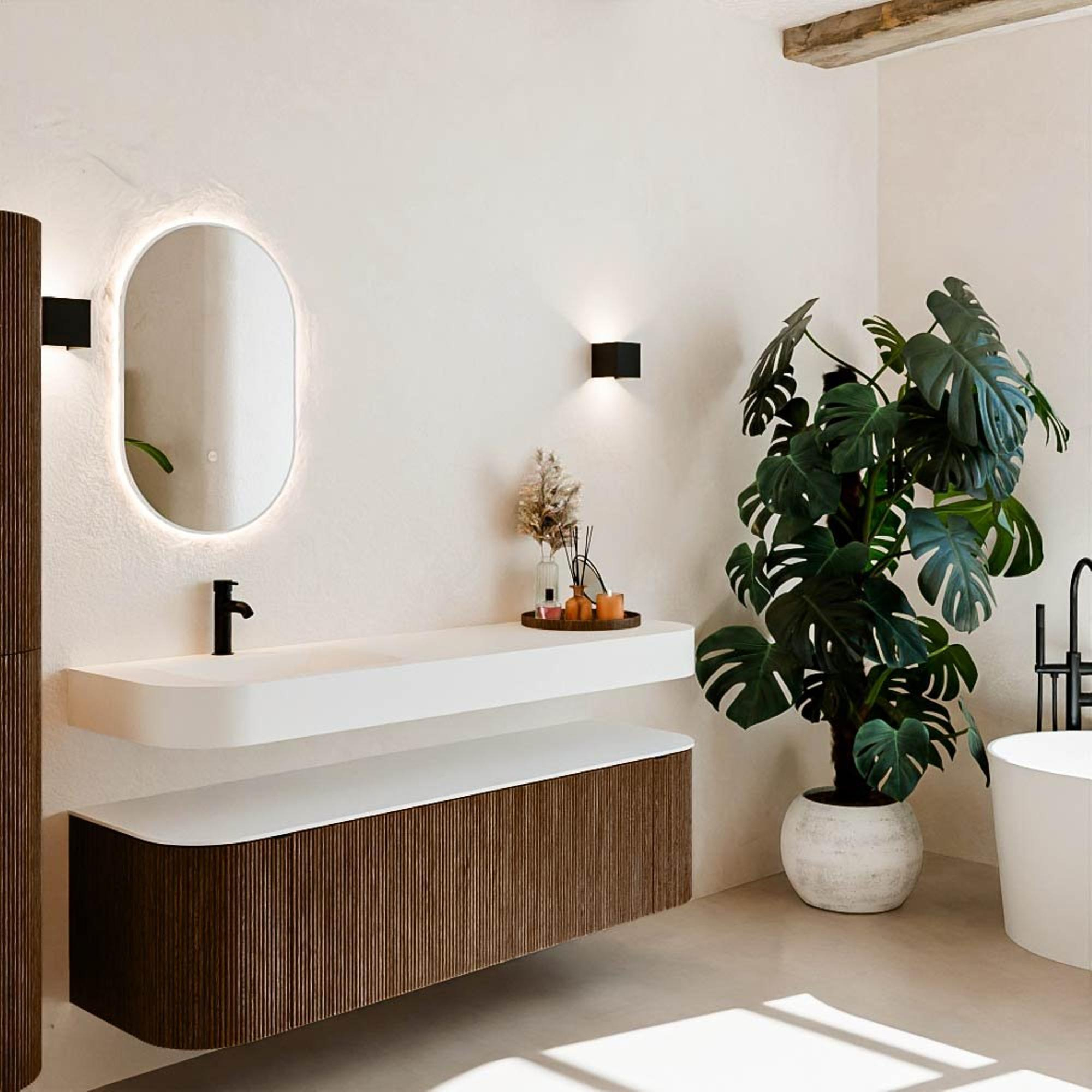 Matériaux naturels dans des tons chauds. Les nervures verticales apportent rythme et texture au design, tandis que le chêne confère une apparence chaleureuse et artisanale. Choisissez parmi 5 teintes de bois OAK, WALNUT, DUSK, SHADOW et RUBY, des couleurs de bois soigneusement sélectionnées pour enrichir les salles de bains modernes et classiques.