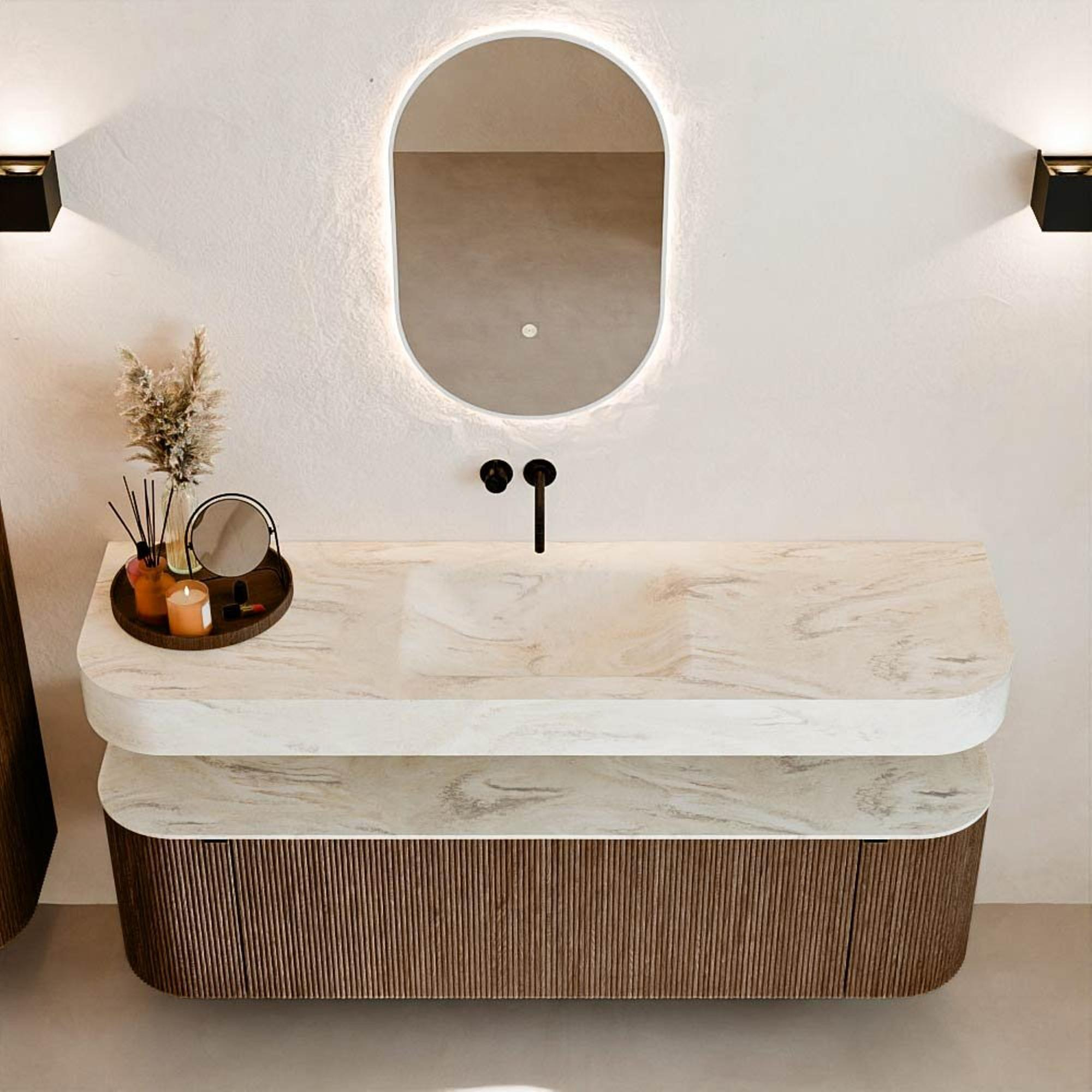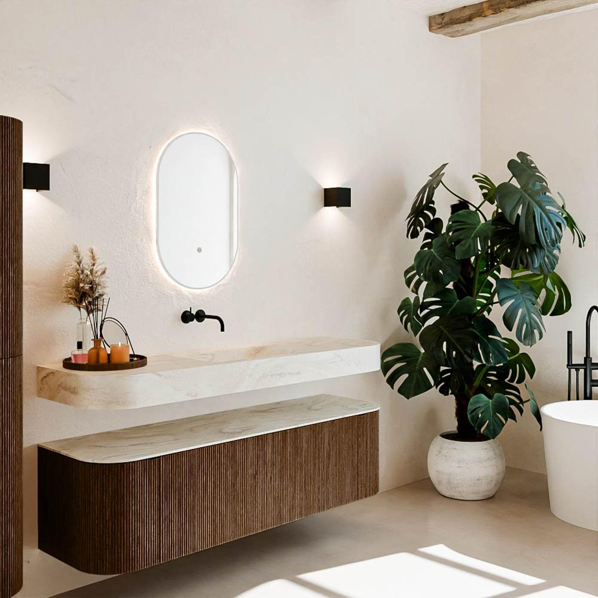 Matériaux naturels dans des tons chauds. Les nervures verticales apportent rythme et texture au design, tandis que le chêne confère une apparence chaleureuse et artisanale. Choisissez parmi 5 teintes de bois OAK, WALNUT, DUSK, SHADOW et RUBY, des couleurs de bois soigneusement sélectionnées pour enrichir les salles de bains modernes et classiques.