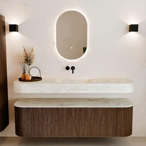 MONDIAZ THOR-DLUX Meuble de salle de bains - 160cm - arrondi gauche + droite - couleur Walnut - 1 tiroir - 2 portes - Vasque suspendue CLOUD Milieu sans trou de robinet - couleur Ostra