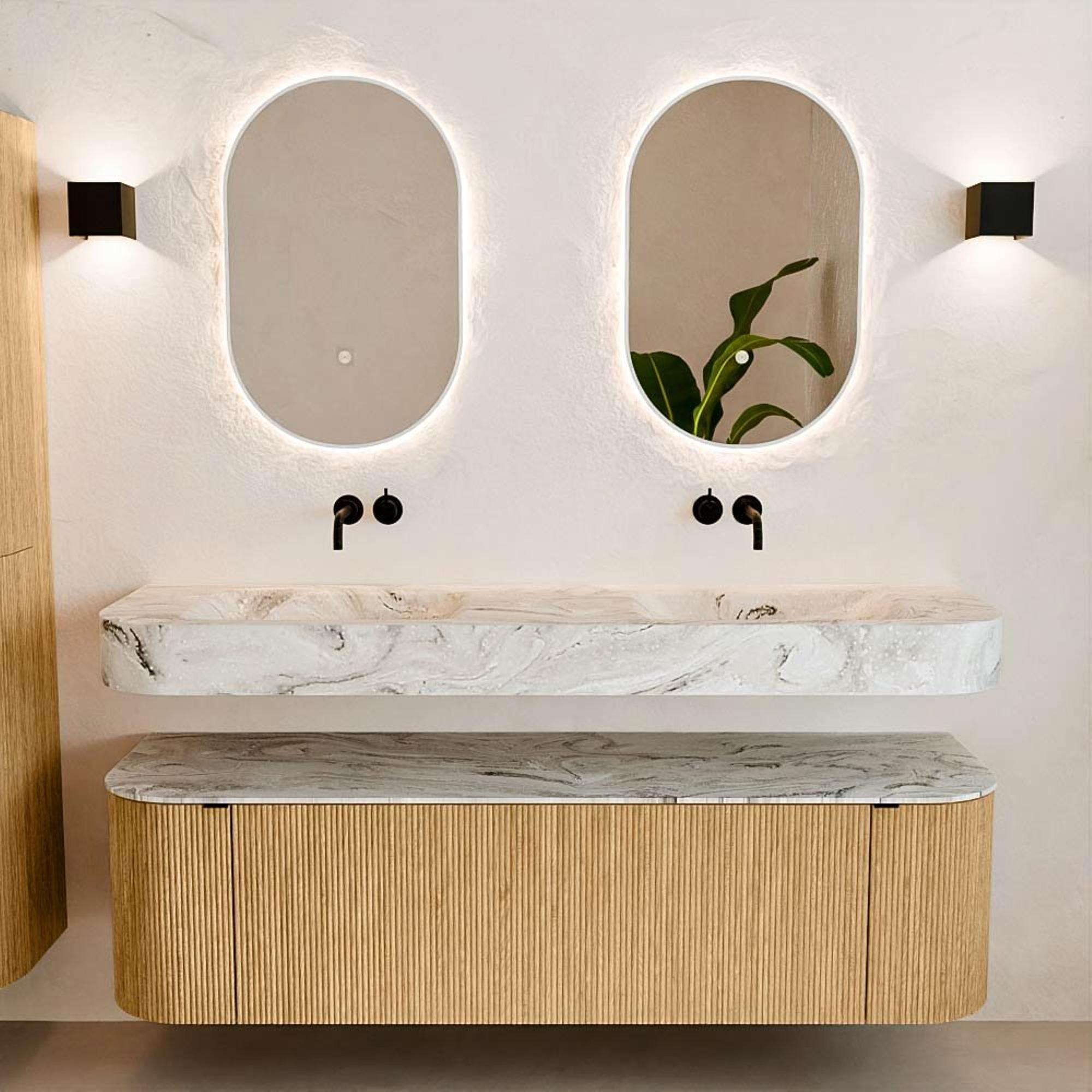 MONDIAZ THOR-DLUX Meuble de salle de bains 160cm arrondi gauche + droite couleur Oak avec 1 tiroir et 2 portes. Vasque suspendue CLOUD Double sans trou de robinet couleur Glace.
