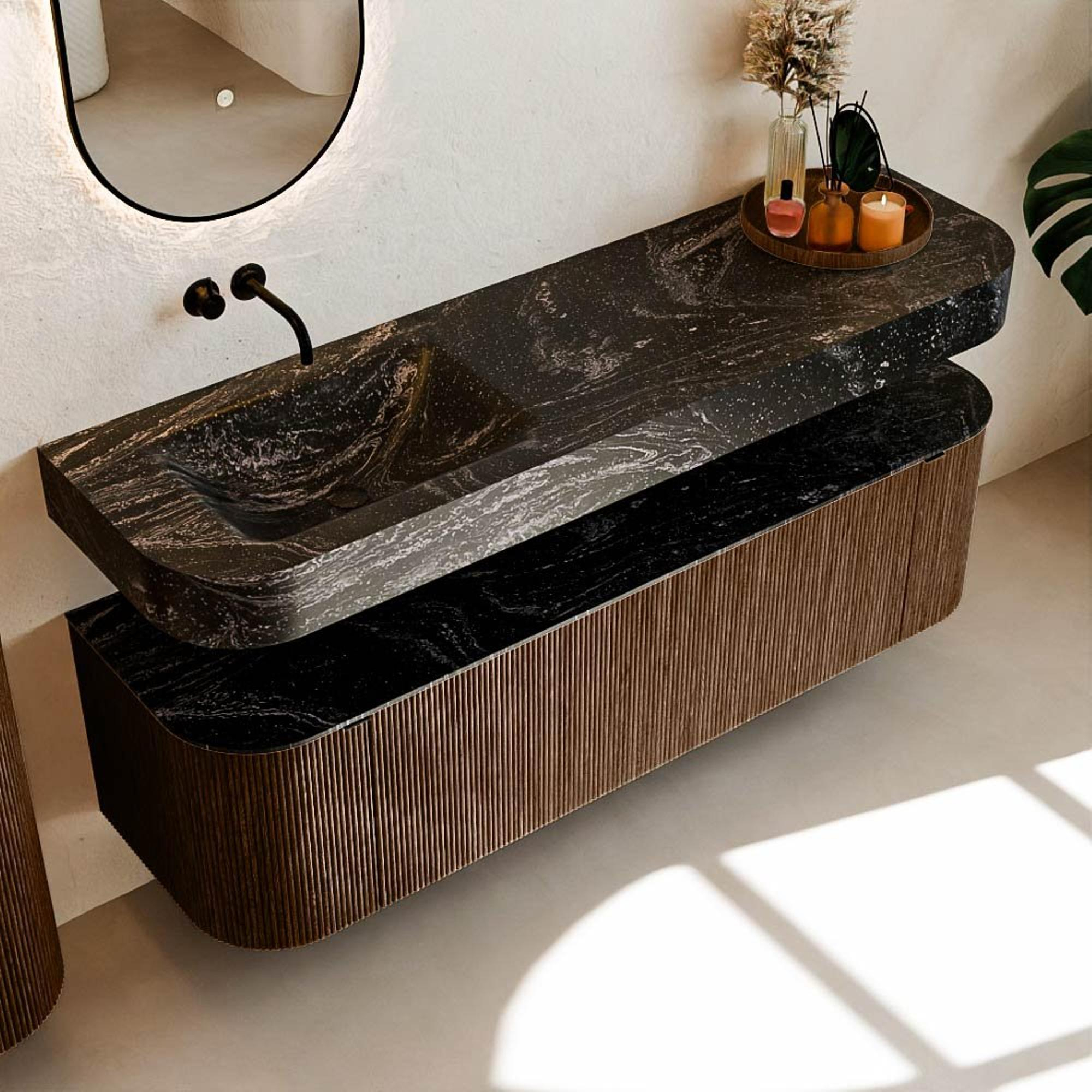 Matériaux naturels dans des tons chauds. Les cannelures verticales apportent rythme et texture au design, tandis que le chêne confère une apparence chaleureuse et artisanale. Choisissez parmi 5 teintes de bois OAK, WALNUT, DUSK, SHADOW et RUBY, des couleurs de bois soigneusement sélectionnées pour enrichir les salles de bains modernes et classiques.