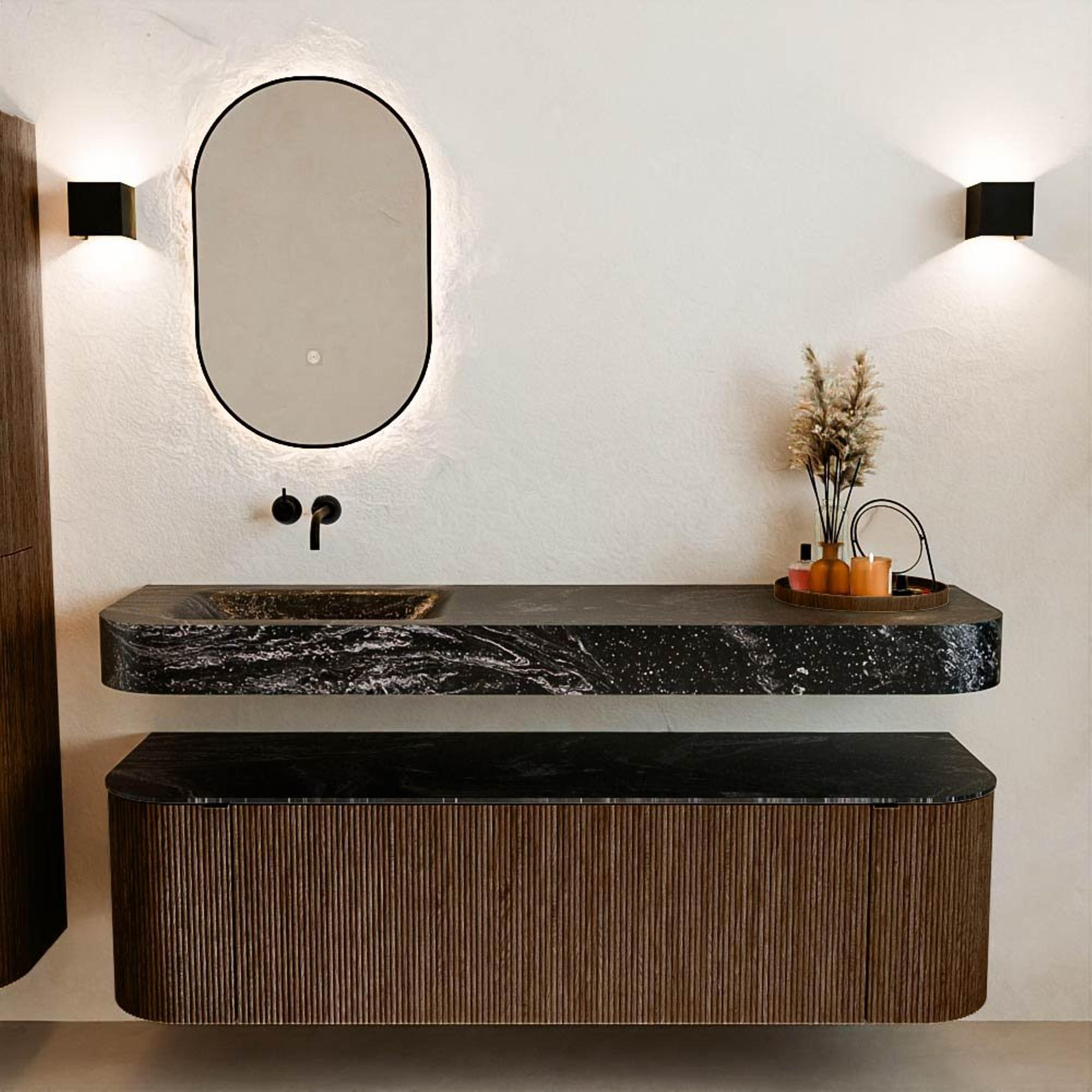 MONDIAZ THOR-DLUX 160cm meuble de salle de bains arrondi gauche + droite couleur Walnut avec 1 tiroir et 2 portes. Vasque suspendue CLOUD gauche sans trou de robinet couleur Lava.