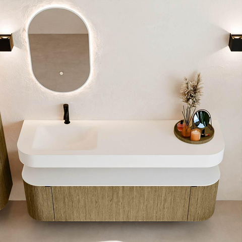 Au-dessus du meuble flotte une vasque suspendue assortie aux coins arrondis – parfaitement adaptée à la forme du meuble. La vasque est en Solid Surface et suit subtilement les lignes du meuble inférieur, créant un ensemble harmonieux. Le plan de travail en Solid Surface constitue une base solide, facile d'entretien et complète la combinaison.