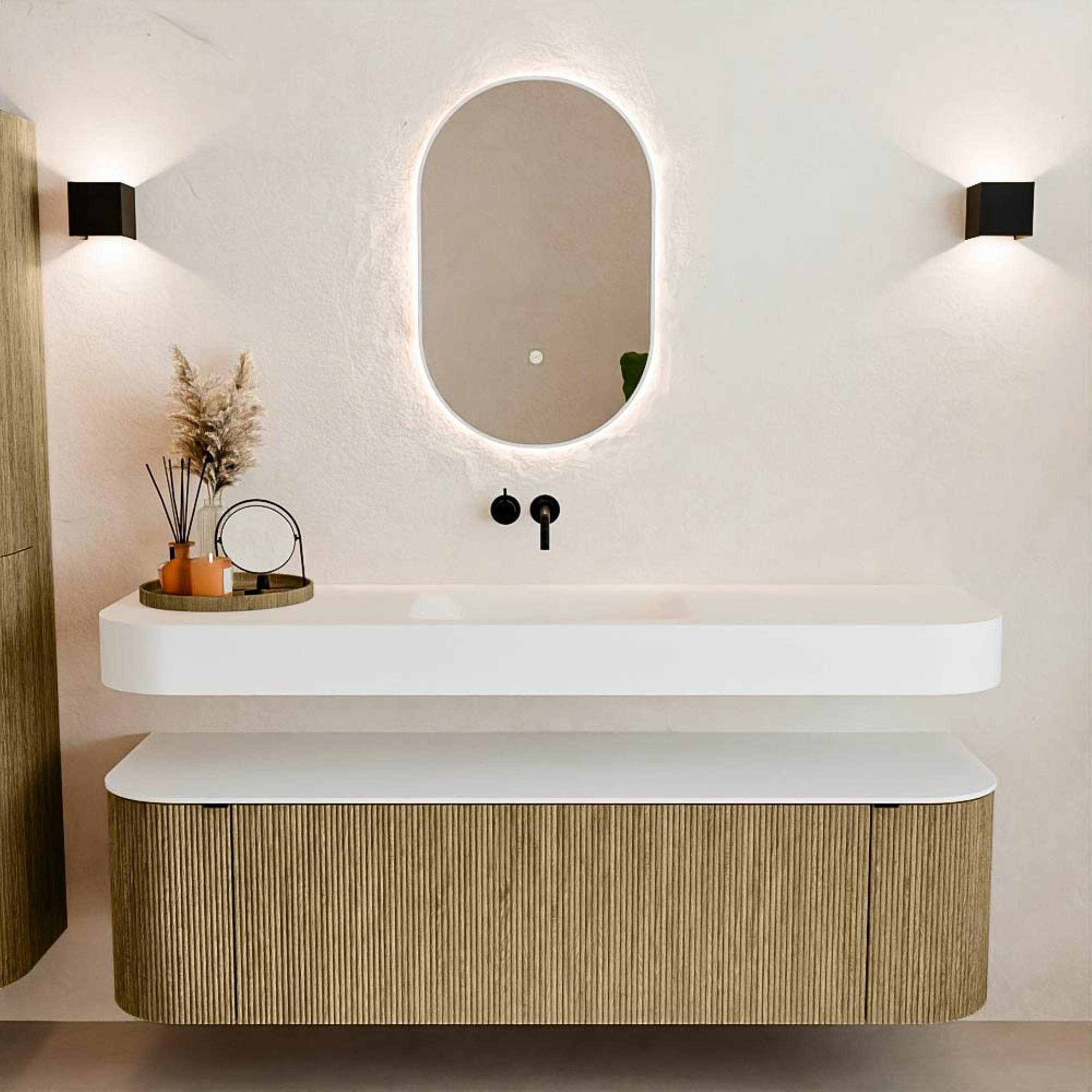 Au-dessus du meuble flotte une vasque suspendue assortie aux coins arrondis – parfaitement adaptée à la forme du meuble. La vasque est en Solid Surface et suit subtilement les lignes du meuble inférieur, créant un ensemble harmonieux. Le plan de travail en Solid Surface constitue une base solide et facile d'entretien, complétant la combinaison.