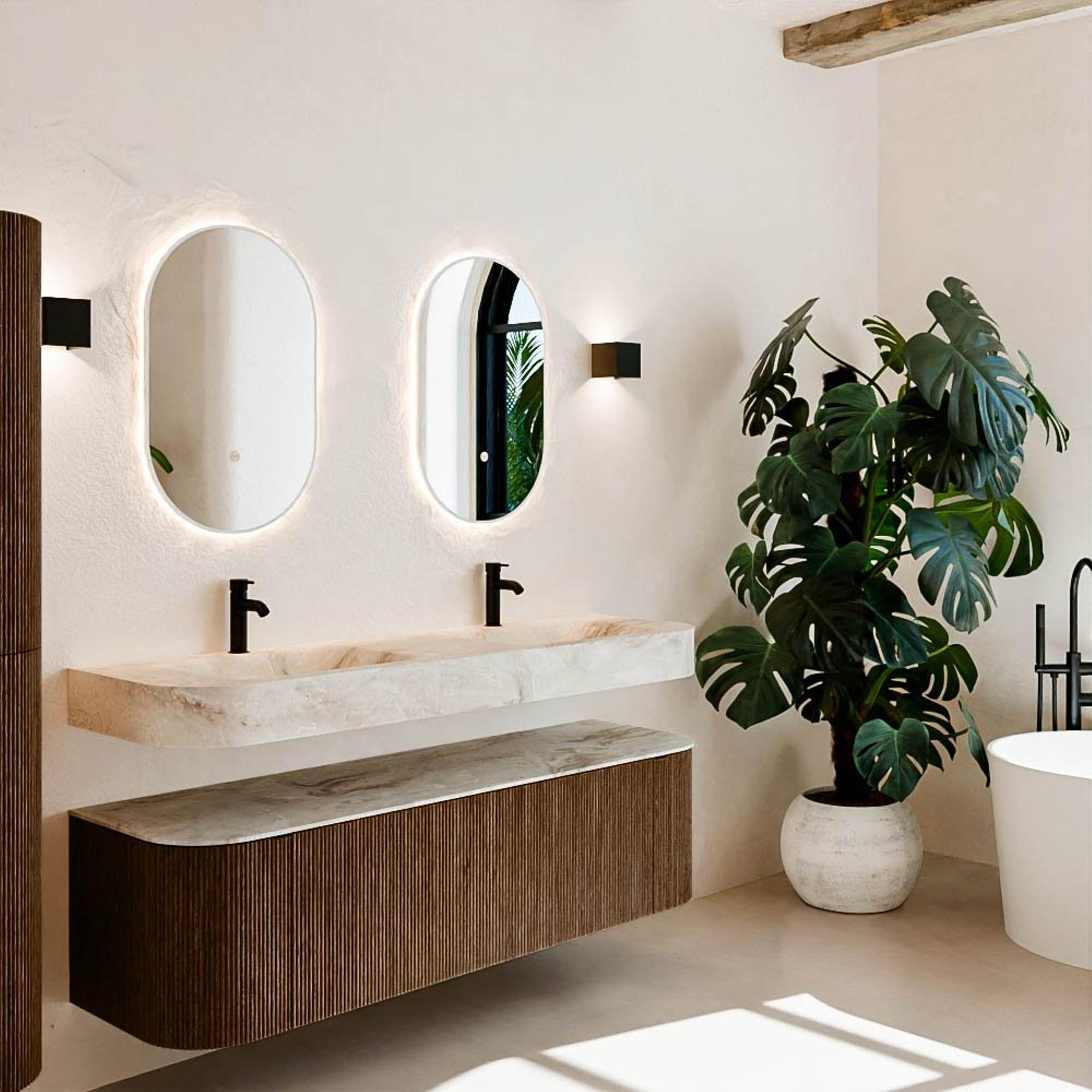 Matériaux naturels dans des tons chauds. Les rainures verticales apportent rythme et texture au design, tandis que le chêne confère une apparence chaleureuse et artisanale. Choisissez parmi 5 teintes de bois OAK, WALNUT, DUSK, SHADOW et RUBY, des couleurs de bois soigneusement sélectionnées pour enrichir les salles de bains modernes et classiques.