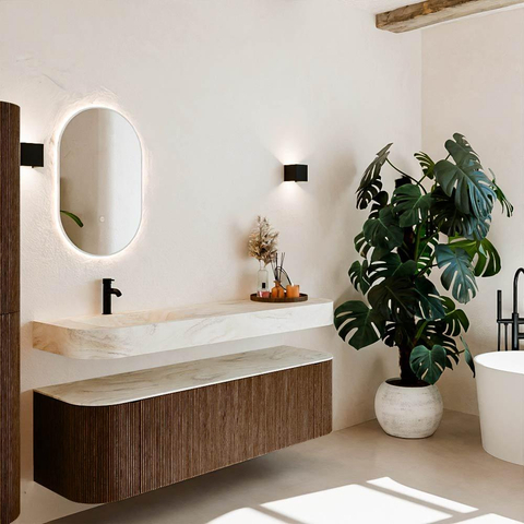 Matériaux naturels dans des tons chauds. Les rainures verticales apportent rythme et texture au design, tandis que le chêne confère une apparence chaleureuse et artisanale. Choisissez parmi 5 teintes de bois OAK, WALNUT, DUSK, SHADOW et RUBY, des couleurs de bois soigneusement sélectionnées pour enrichir les salles de bains modernes et classiques.