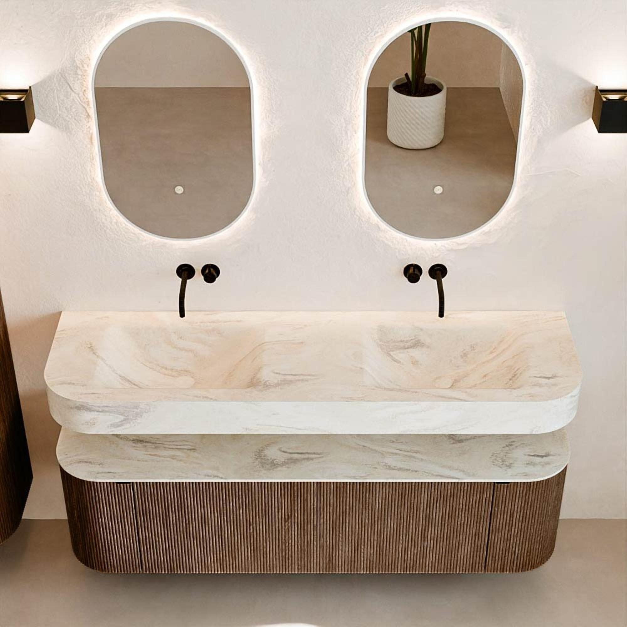 MONDIAZ THOR-DLUX 160cm meuble de salle de bains arrondi gauche + droite couleur Walnut avec 1 tiroir et 2 portes. Vasque suspendue CLOUD Double sans trou de robinet couleur Ostra.