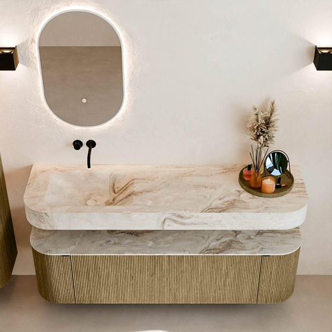 Au-dessus du meuble flotte une vasque suspendue assortie aux coins arrondis – parfaitement adaptée à la forme du meuble. La vasque est en Solid Surface et suit subtilement les lignes du meuble inférieur, créant un ensemble harmonieux. Le plan de travail en Solid Surface constitue une base solide et facile d'entretien, complétant la combinaison.