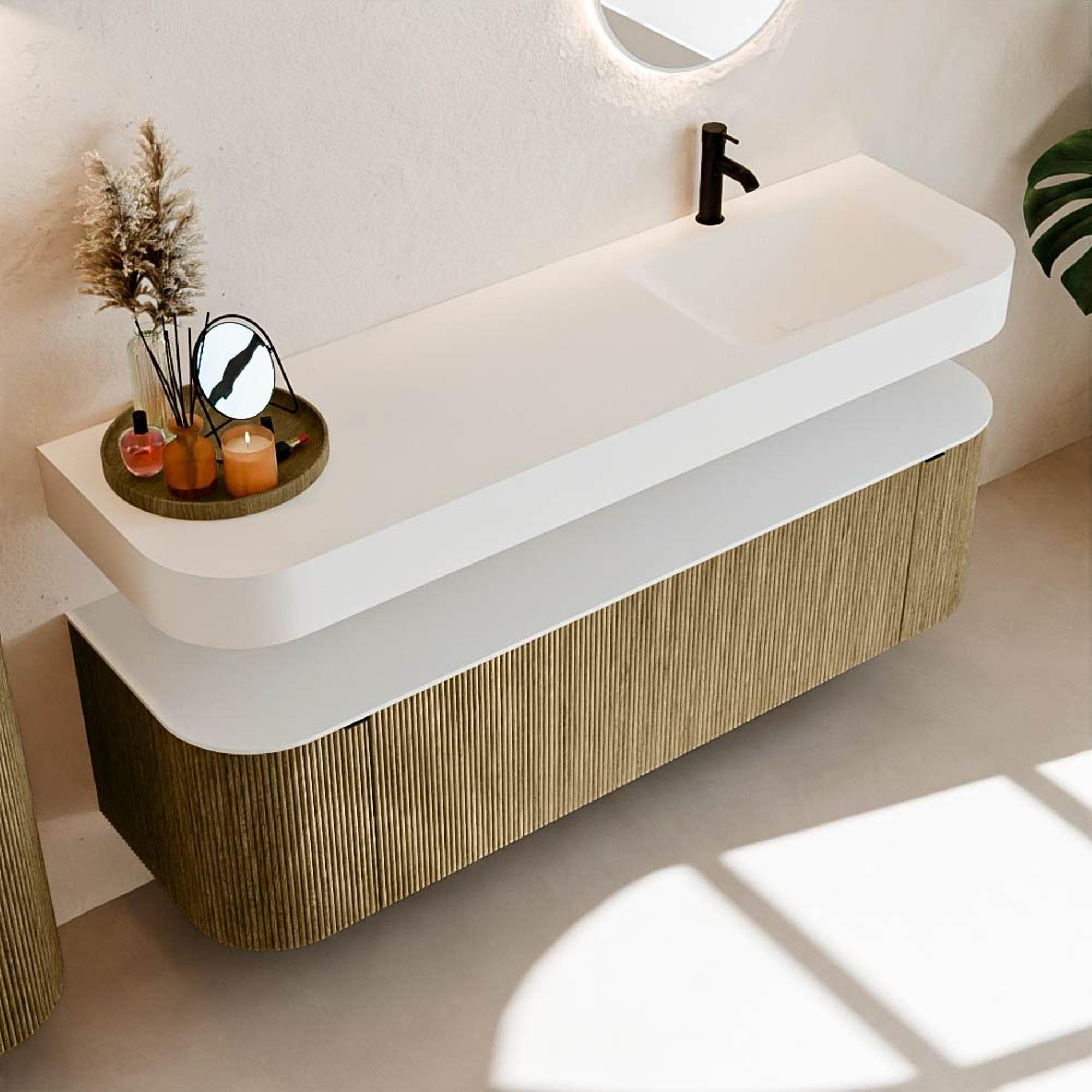 Au-dessus du meuble flotte une vasque suspendue assortie aux coins arrondis – parfaitement adaptée à la forme du meuble. La vasque est réalisée en Solid Surface et suit subtilement les lignes du meuble inférieur, créant ainsi un ensemble harmonieux. Le plan de travail en Solid Surface forme une base solide et facile d'entretien et complète la combinaison.