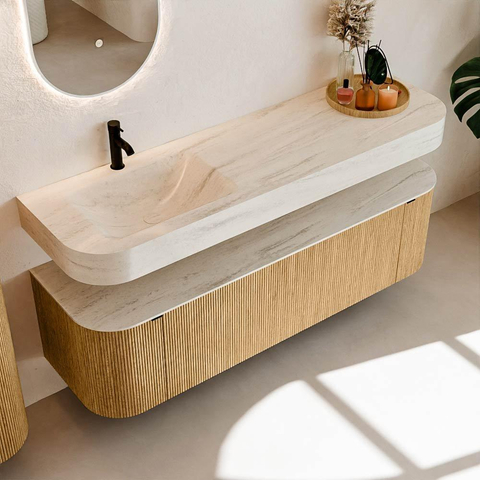 Matériaux naturels dans des tons chauds. Les cannelures verticales apportent rythme et texture au design, tandis que le chêne confère une apparence chaleureuse et artisanale. Choisissez parmi 5 teintes de bois OAK, WALNUT, DUSK, SHADOW et RUBY, des couleurs de bois soigneusement sélectionnées pour enrichir les salles de bains modernes et classiques.
