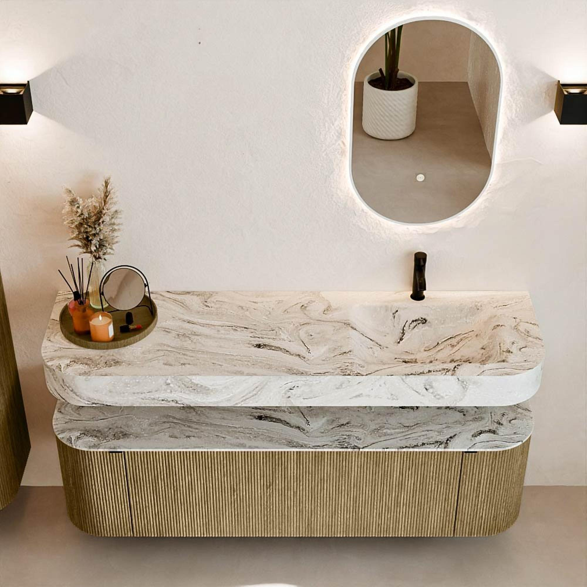 Matériaux naturels dans des tons chauds. Les nervures verticales apportent rythme et texture au design, tandis que le chêne confère une apparence chaleureuse et artisanale. Choisissez parmi 5 teintes de bois OAK, WALNUT, DUSK, SHADOW et RUBY, des couleurs de bois soigneusement sélectionnées pour enrichir les salles de bains modernes et classiques.