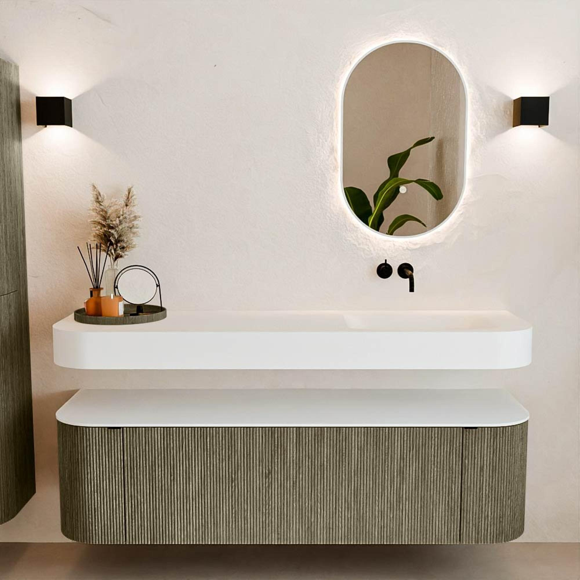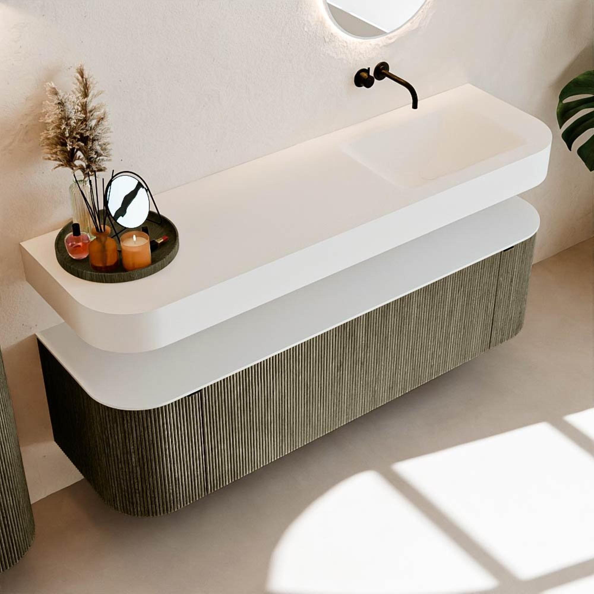 Au-dessus du meuble flotte une vasque suspendue assortie aux coins arrondis – parfaitement adaptée à la forme du meuble. La vasque est en Solid Surface et suit subtilement les lignes du meuble inférieur, créant une harmonie parfaite. Le plan de travail en Solid Surface constitue une base solide et facile d'entretien, complétant l'ensemble.