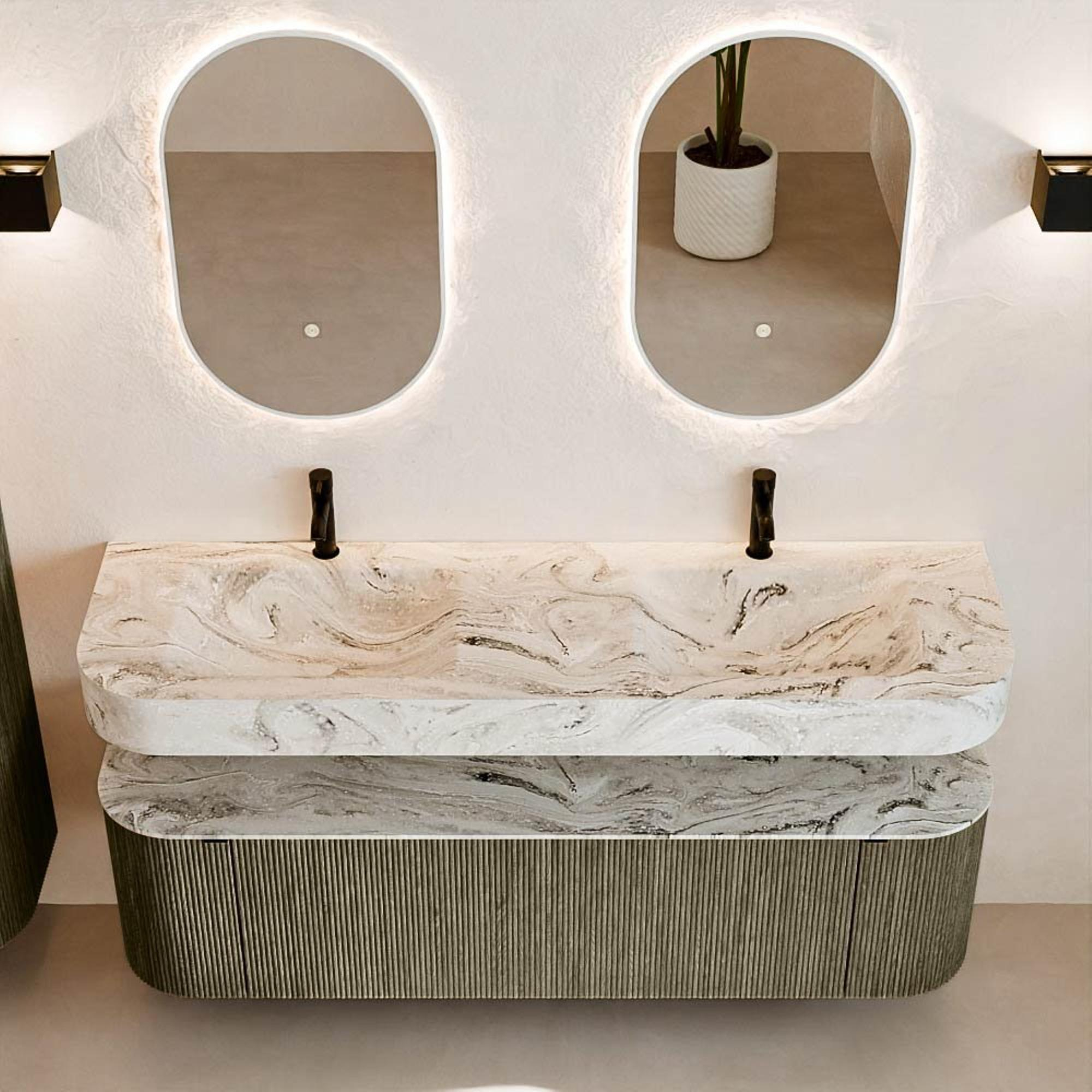 Matériaux naturels dans des tons chauds. Les nervures verticales apportent rythme et texture au design, tandis que le chêne confère une apparence chaleureuse et artisanale. Choisissez parmi 5 teintes de bois OAK, WALNUT, DUSK, SHADOW et RUBY, des couleurs de bois soigneusement sélectionnées pour enrichir les salles de bains modernes et classiques.
