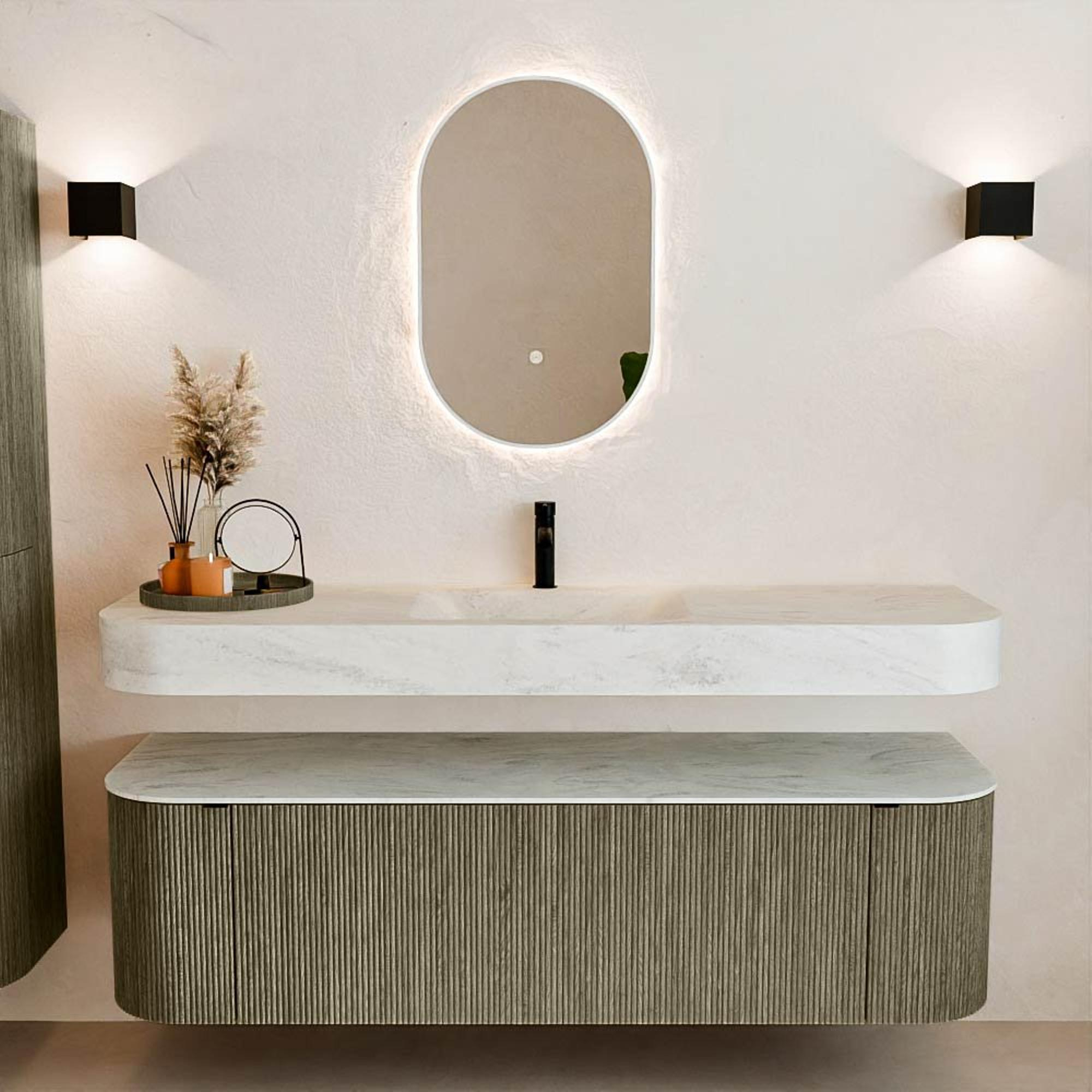 Au-dessus du meuble flotte une vasque suspendue assortie aux coins arrondis – parfaitement adaptée à la forme du meuble. La vasque est réalisée en Solid Surface et suit subtilement les lignes du meuble inférieur, créant ainsi un ensemble harmonieux. Le plan de travail en Solid Surface forme une base solide, facile d'entretien, et complète la combinaison.