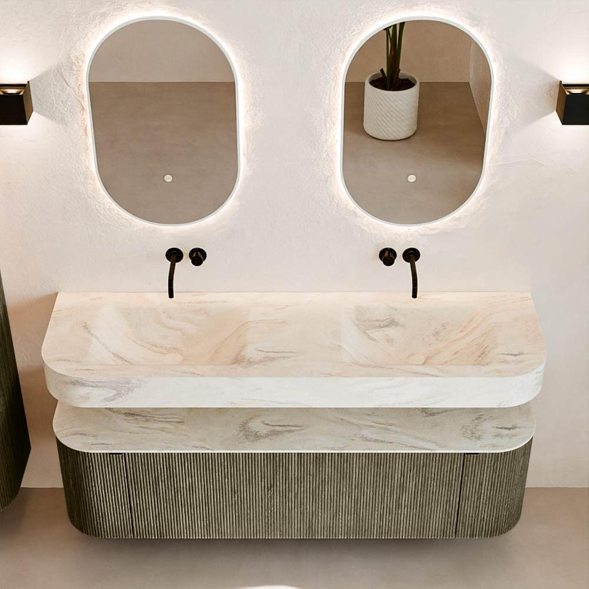 Au-dessus du meuble flotte une vasque suspendue assortie aux coins arrondis – parfaitement adaptée à la forme du meuble. La vasque est réalisée en Solid Surface et suit subtilement les lignes du meuble inférieur, créant ainsi un ensemble harmonieux. Le plan de travail en Solid Surface forme une base solide, facile d'entretien, et complète la combinaison.