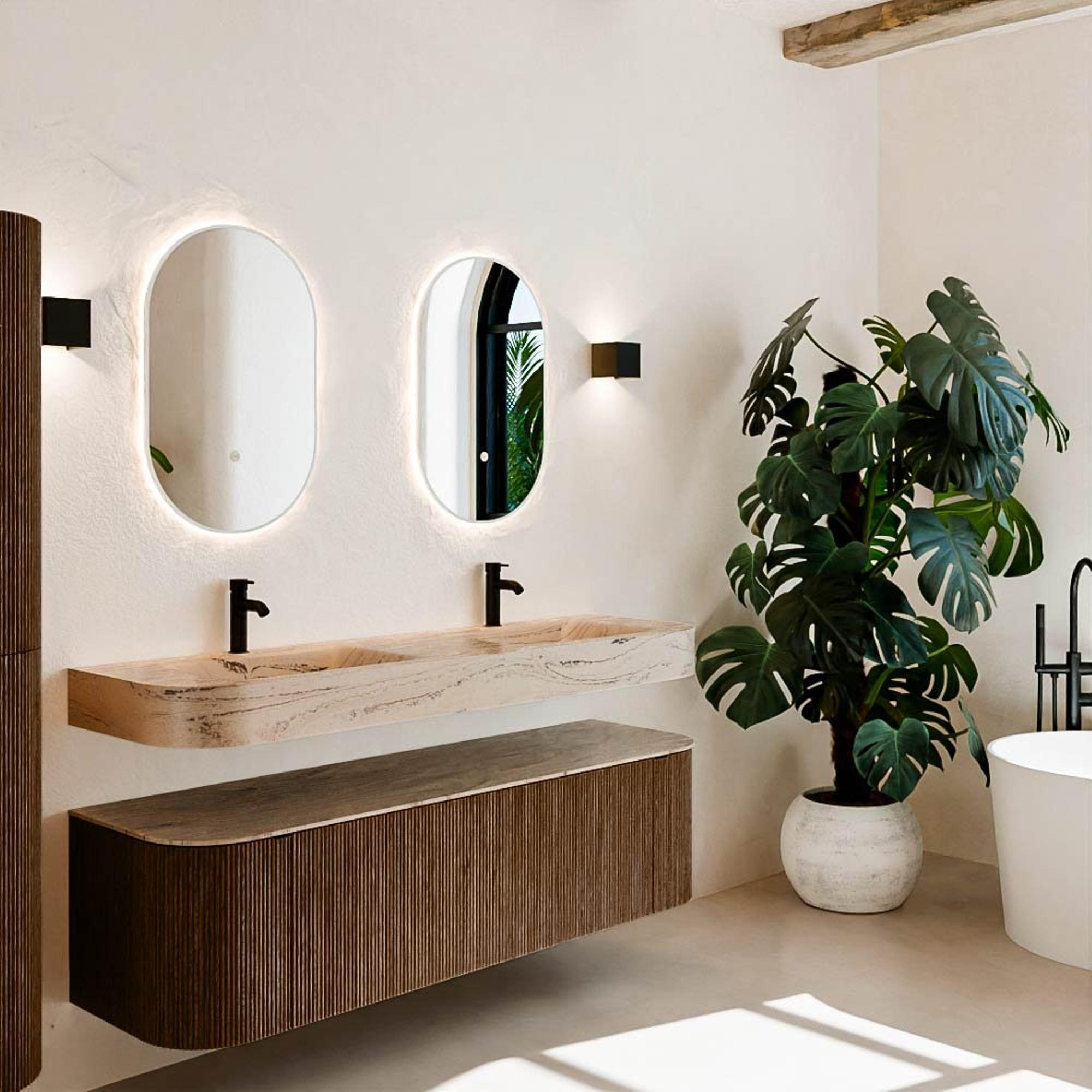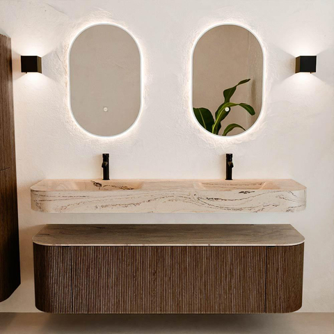 Matériaux naturels dans des tons chauds. Les nervures verticales apportent rythme et texture au design, tandis que le chêne confère une apparence chaleureuse et artisanale. Choisissez parmi 5 teintes de bois OAK, WALNUT, DUSK, SHADOW et RUBY, des couleurs de bois soigneusement sélectionnées pour enrichir les salles de bains modernes et classiques.