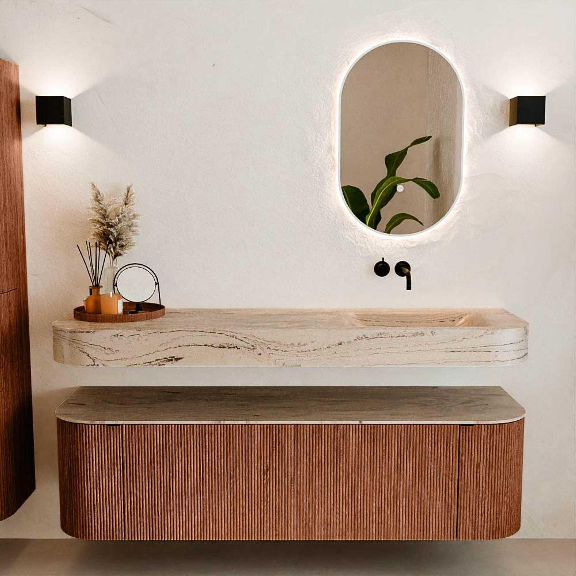 Au-dessus du meuble flotte une vasque suspendue assortie aux coins arrondis – parfaitement adaptée à la forme du meuble. La vasque est en Solid Surface et suit subtilement les lignes du meuble sous-jacent, créant un ensemble harmonieux. Le plan de travail en Solid Surface forme une base solide, facile d'entretien et complète la combinaison.