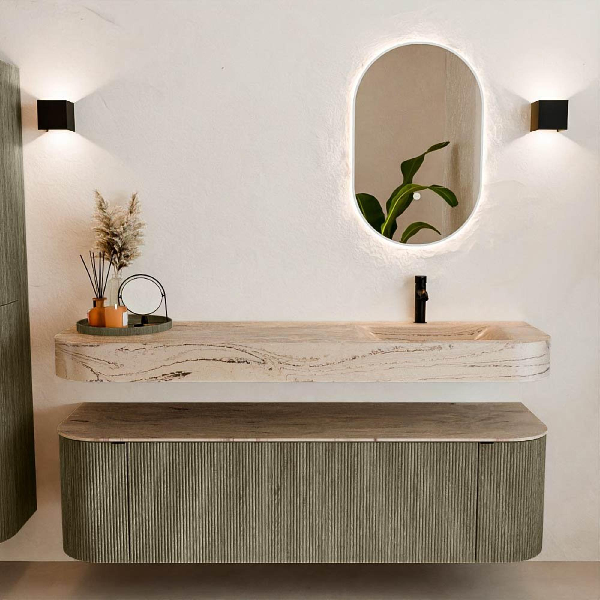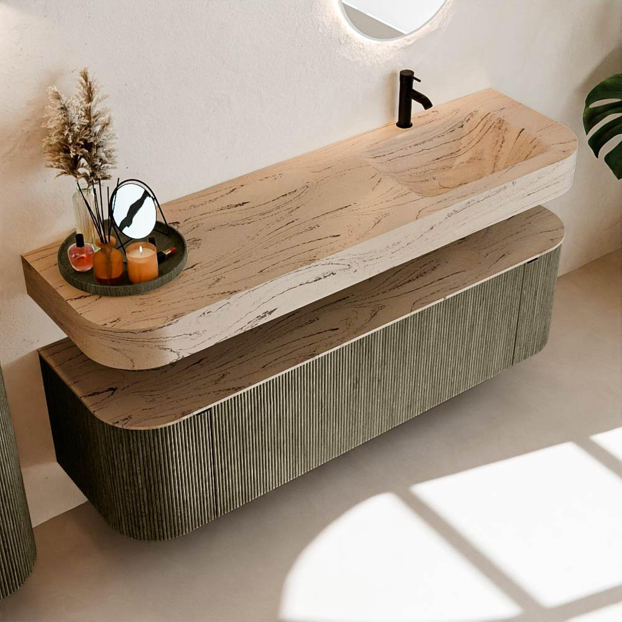 Au-dessus du meuble flotte une vasque suspendue assortie aux coins arrondis – parfaitement adaptée à la forme du meuble. La vasque est réalisée en Solid Surface et suit subtilement les lignes du meuble inférieur, créant ainsi un ensemble harmonieux. Le plan de travail en Solid Surface constitue une base solide et facile d'entretien, complétant la combinaison.