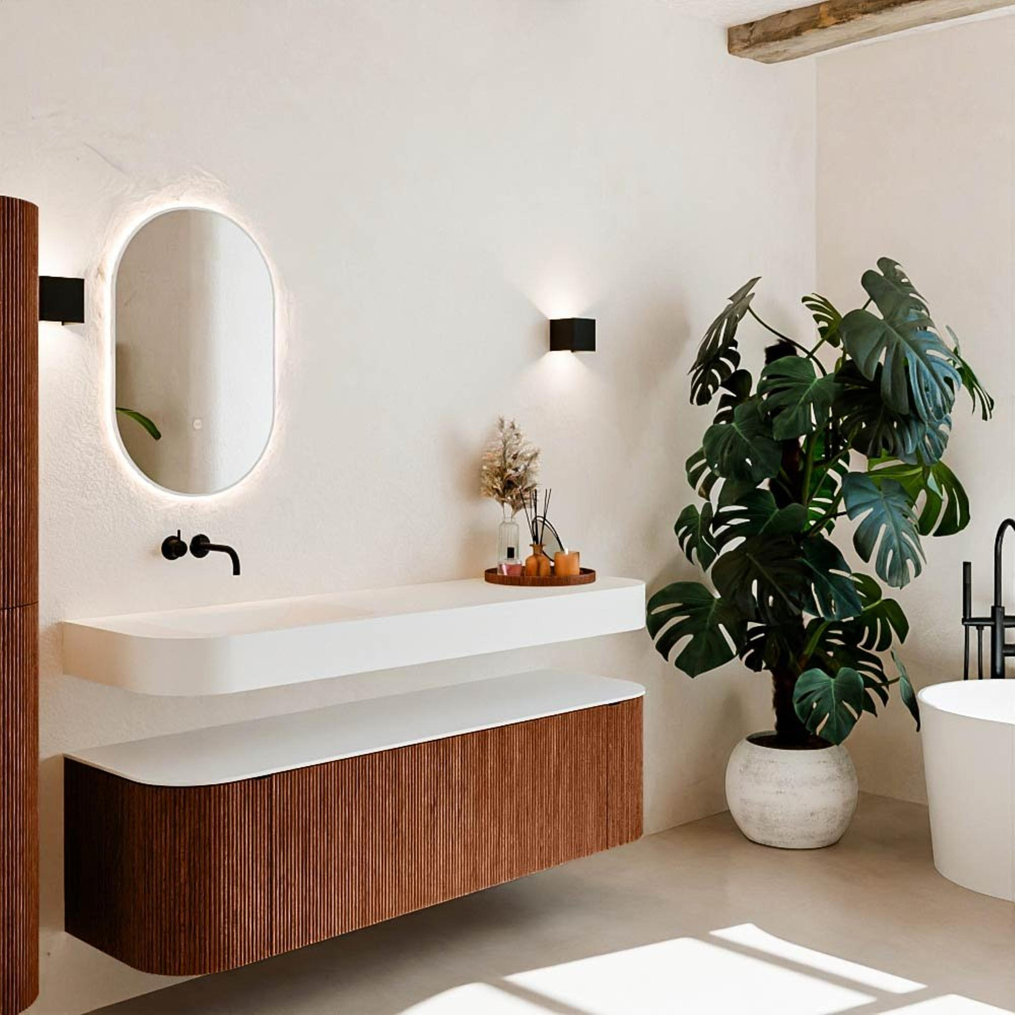 Matériaux naturels dans des tons chauds. Les nervures verticales apportent rythme et texture au design, tandis que le chêne confère une apparence chaleureuse et artisanale. Choisissez parmi 5 teintes de bois OAK, WALNUT, DUSK, SHADOW et RUBY, des couleurs de bois soigneusement sélectionnées pour enrichir les salles de bains modernes et classiques.