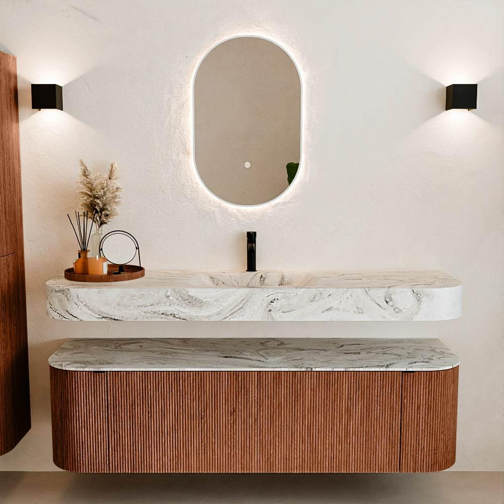 Au-dessus du meuble flotte une vasque suspendue assortie aux coins arrondis – parfaitement adaptée à la forme du meuble. La vasque est réalisée en Solid Surface et suit subtilement les lignes du meuble inférieur, créant ainsi un ensemble harmonieux. Le plan de travail en Solid Surface forme une base solide, facile d'entretien et complète la combinaison.
