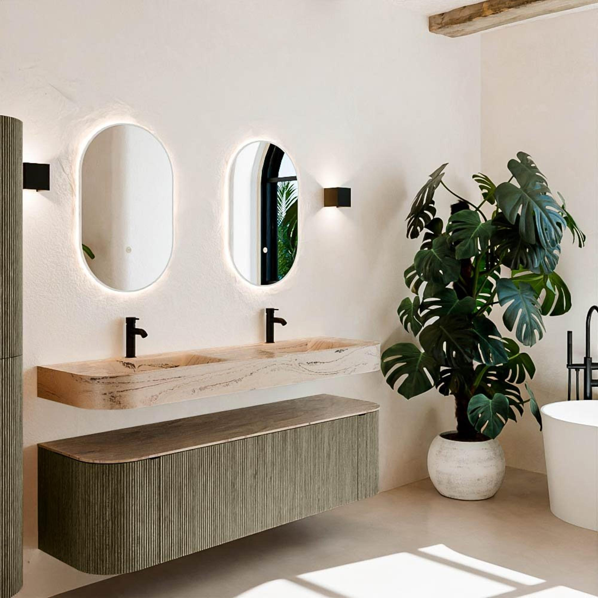 Matériaux naturels dans des tons chauds. Les nervures verticales apportent rythme et texture au design, tandis que le chêne confère une apparence chaleureuse et artisanale. Choisissez parmi 5 teintes de bois OAK, WALNUT, DUSK, SHADOW et RUBY, des couleurs de bois soigneusement sélectionnées pour enrichir les salles de bains modernes et classiques.