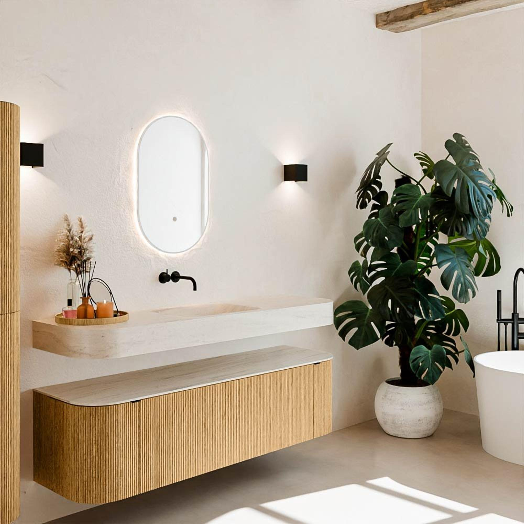 Matériaux naturels aux teintes chaudes. Les nervures verticales apportent rythme et texture au design, tandis que le chêne confère une apparence chaleureuse et artisanale. Choisissez parmi 5 teintes de bois OAK, WALNUT, DUSK, SHADOW et RUBY, des couleurs de bois soigneusement sélectionnées pour enrichir les salles de bains modernes et classiques.
