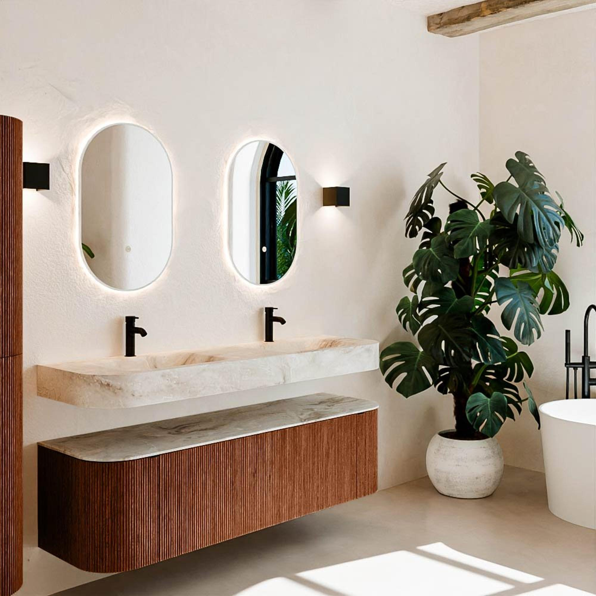 Matériaux naturels dans des tons chauds. Les rainures verticales apportent rythme et texture au design, tandis que le chêne confère une apparence chaleureuse et artisanale. Choisissez parmi 5 teintes de bois OAK, WALNUT, DUSK, SHADOW et RUBY, des couleurs de bois soigneusement sélectionnées pour enrichir les salles de bains modernes et classiques.