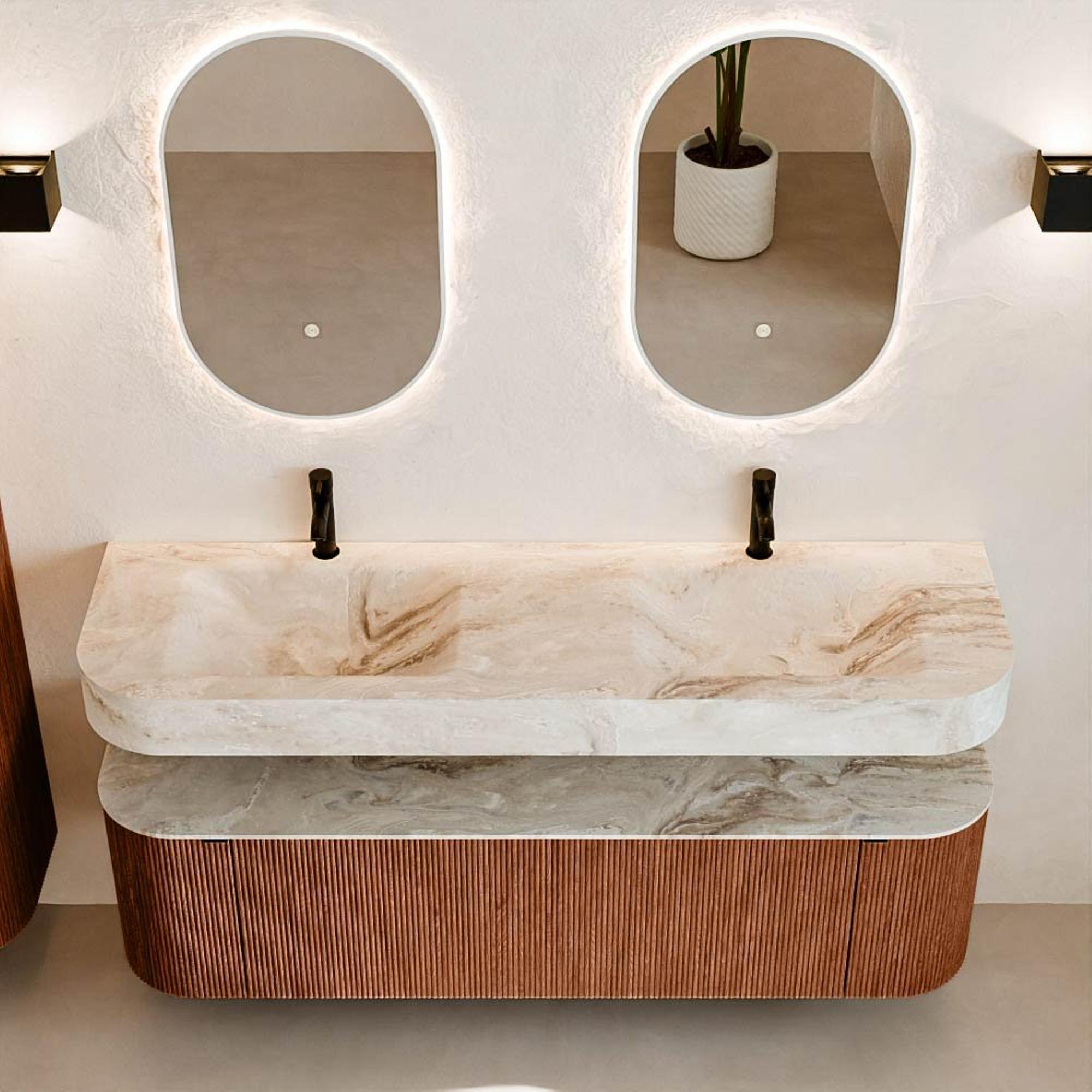 Au-dessus du meuble flotte une vasque suspendue assortie aux coins arrondis – parfaitement adaptée à la forme du meuble. La vasque est réalisée en Solid Surface et suit subtilement les lignes du meuble inférieur, créant ainsi un ensemble harmonieux. Le plan de travail en Solid Surface forme une base solide, facile d'entretien et complète la combinaison.