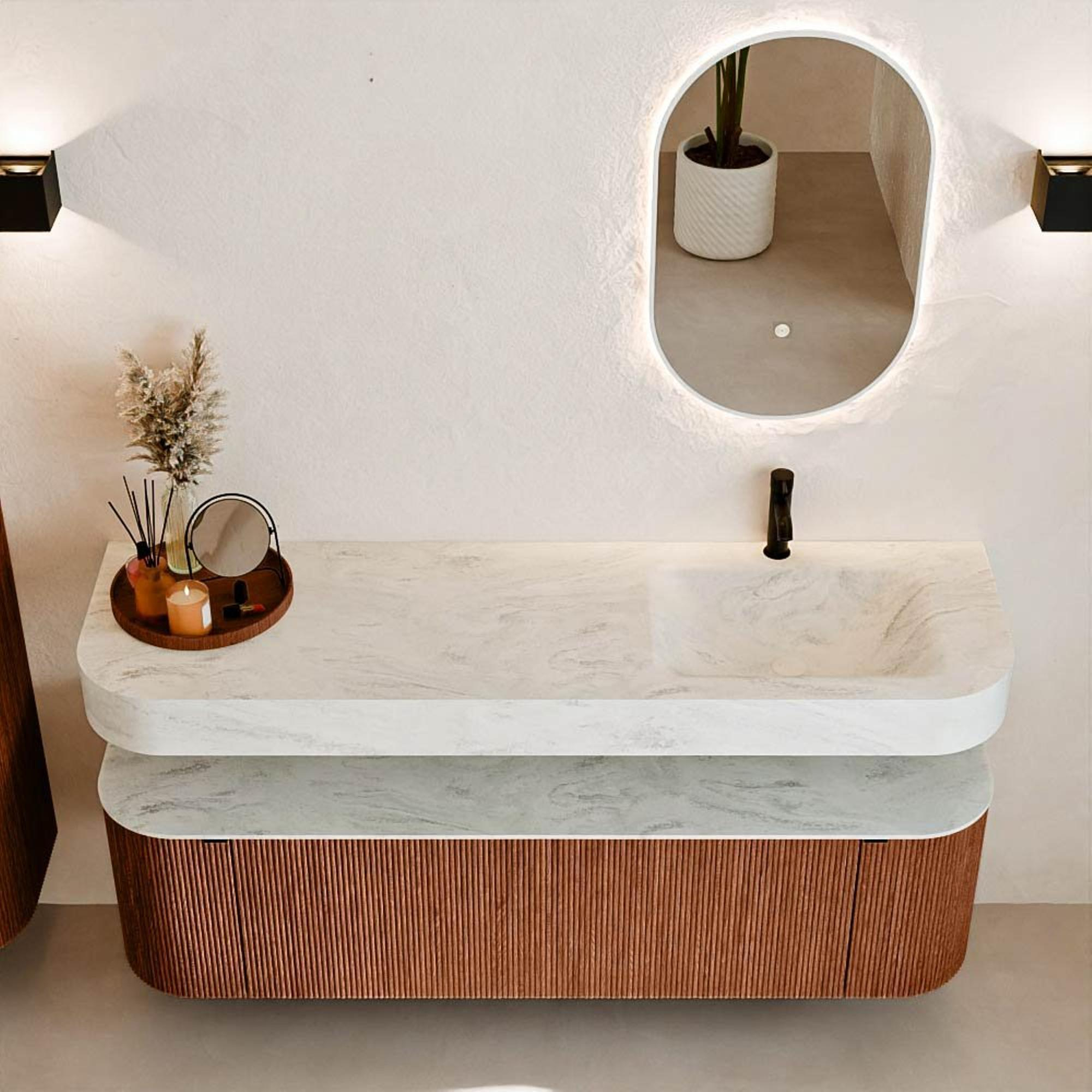 Matériaux naturels dans des tons chauds. Les cannelures verticales apportent rythme et texture au design, tandis que le chêne confère une apparence chaleureuse et artisanale. Choisissez parmi 5 teintes de bois OAK, WALNUT, DUSK, SHADOW et RUBY, des couleurs de bois soigneusement sélectionnées pour enrichir les salles de bains modernes et classiques.