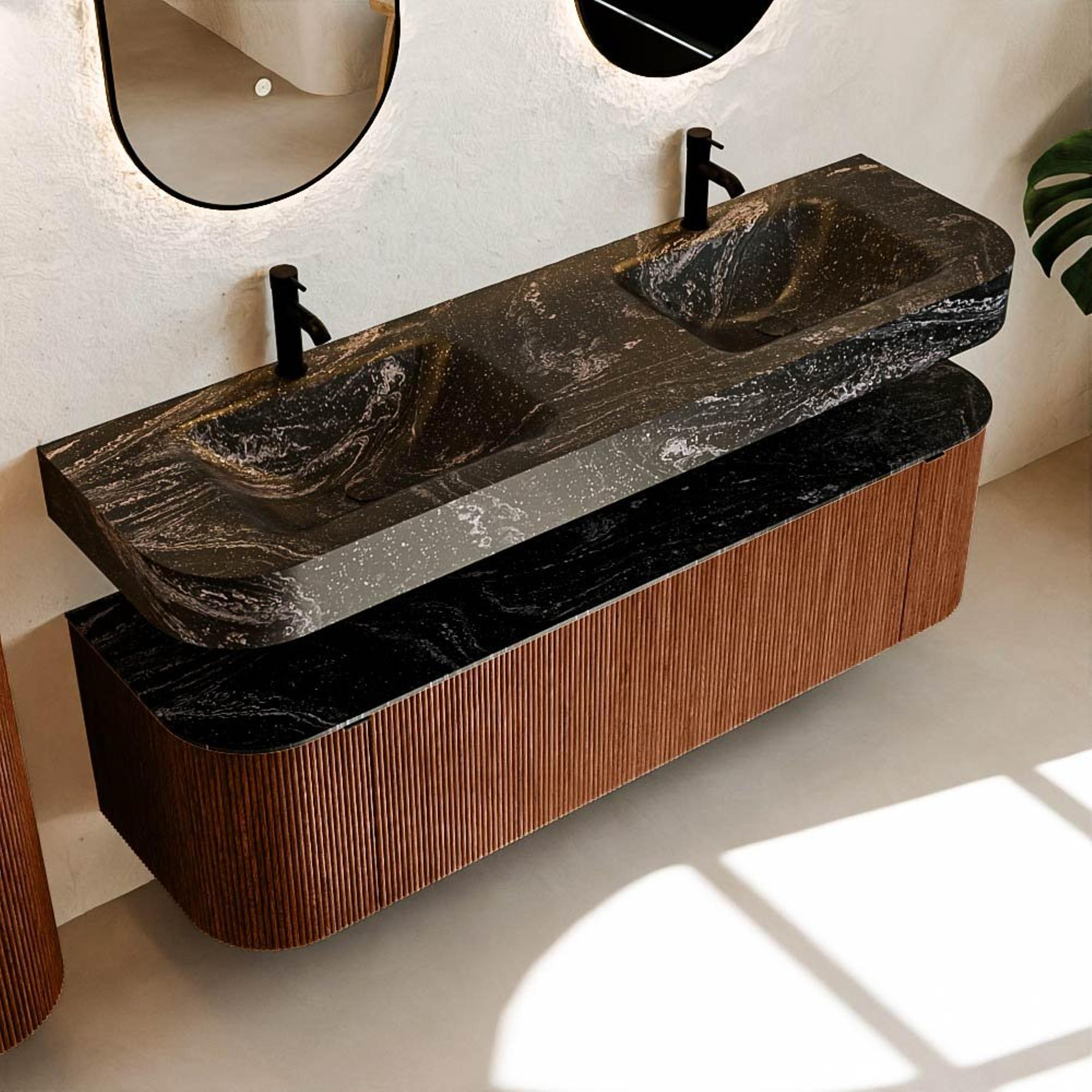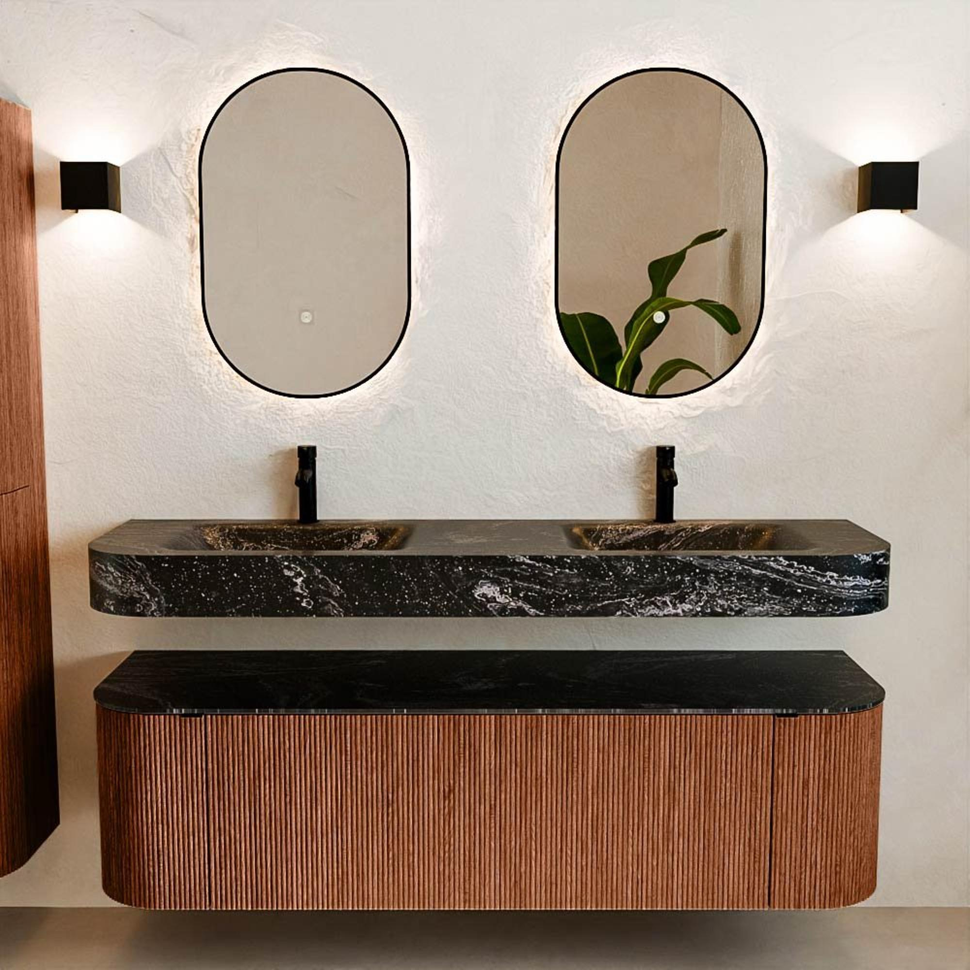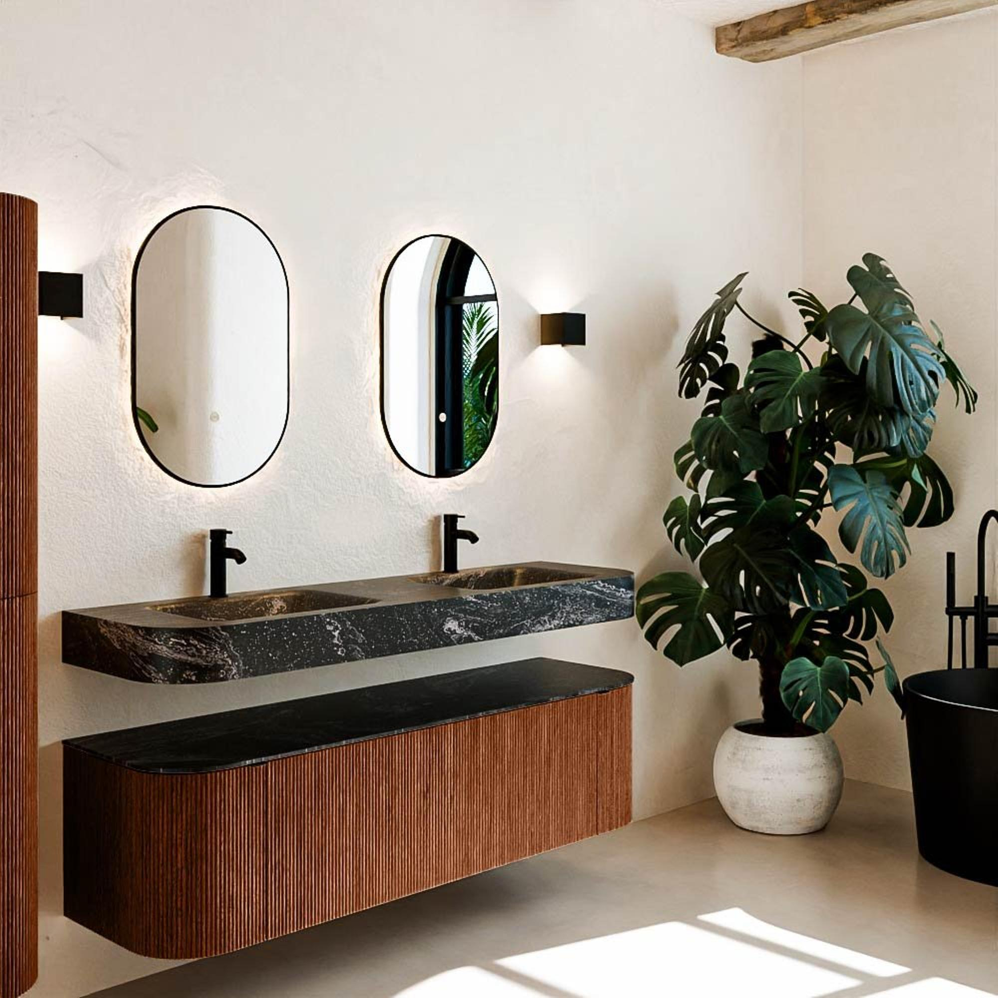 Matériaux naturels dans des tons chauds. Les cannelures verticales apportent rythme et texture au design, tandis que le chêne confère une apparence chaleureuse et artisanale. Choisissez parmi 5 teintes de bois OAK, WALNUT, DUSK, SHADOW et RUBY, des couleurs de bois soigneusement sélectionnées pour enrichir les salles de bains modernes et classiques.