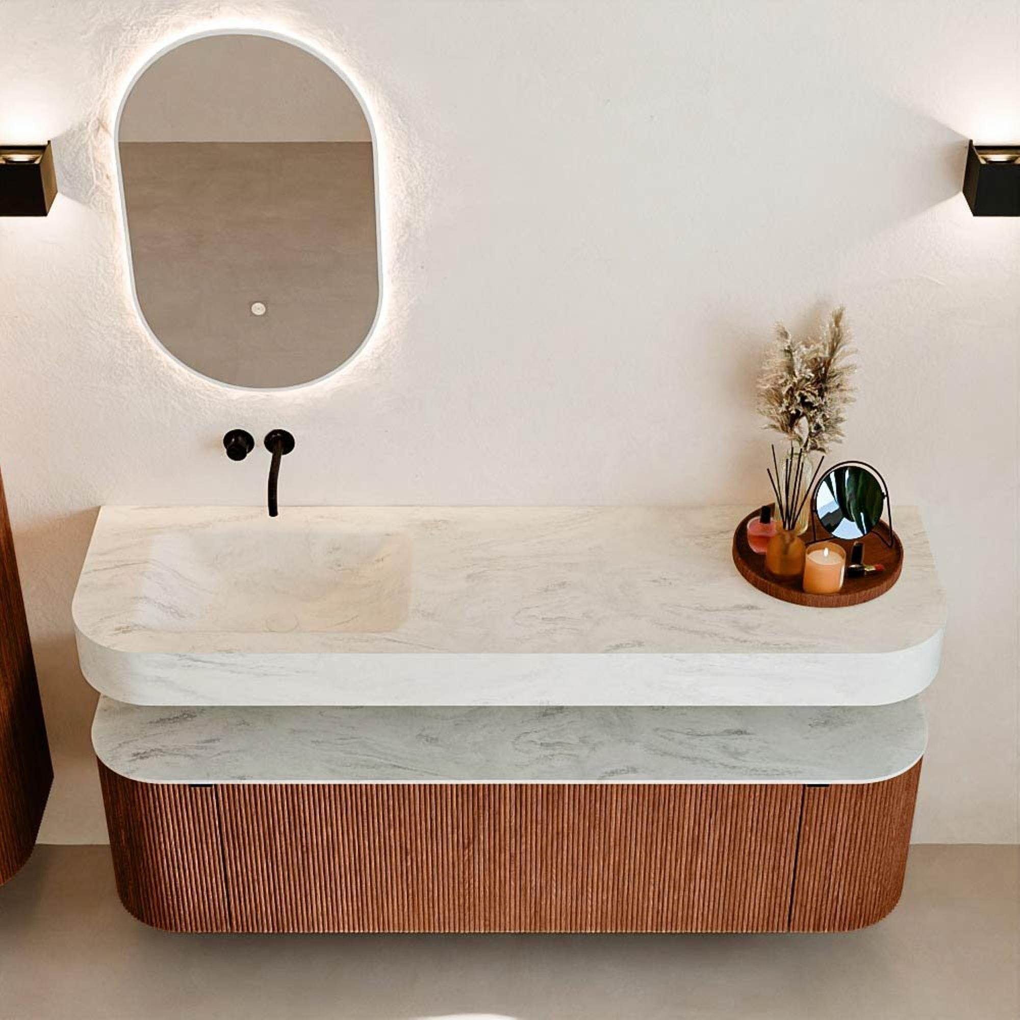 Au-dessus du meuble flotte une vasque suspendue assortie aux coins arrondis – parfaitement adaptée à la forme du meuble. La vasque est réalisée en Solid Surface et suit subtilement les lignes du meuble inférieur, créant ainsi un ensemble harmonieux. Le plan de travail en Solid Surface constitue une base solide et facile d'entretien et complète la combinaison.