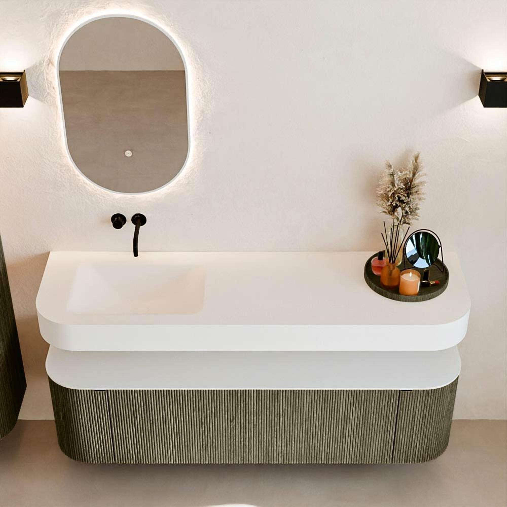 Au-dessus du meuble flotte une vasque suspendue assortie avec des coins arrondis – parfaitement adaptée à la forme du meuble. La vasque est réalisée en Solid Surface et suit subtilement les lignes du meuble sous-jacent, créant ainsi un ensemble harmonieux. Le plan de travail en Solid Surface constitue une base solide et facile d'entretien, complétant la combinaison.