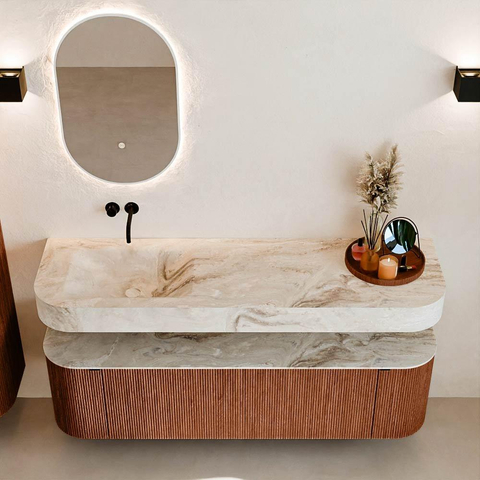Au-dessus du meuble flotte une vasque suspendue assortie aux coins arrondis – parfaitement adaptée à la forme du meuble. La vasque est en Solid Surface et suit subtilement les lignes du meuble inférieur, créant ainsi un ensemble harmonieux. Le plan de travail en Solid Surface forme une base solide et facile d'entretien et complète la combinaison.