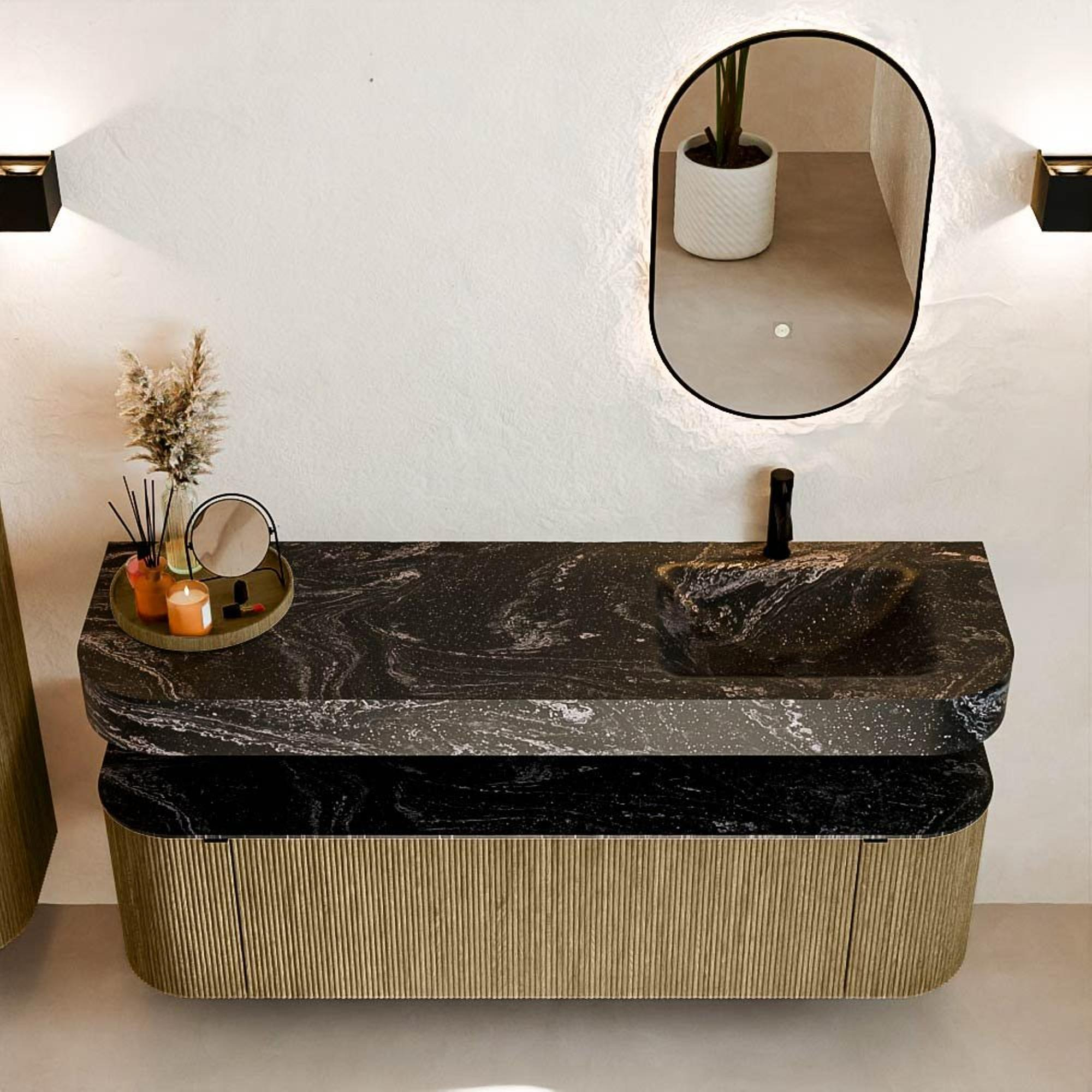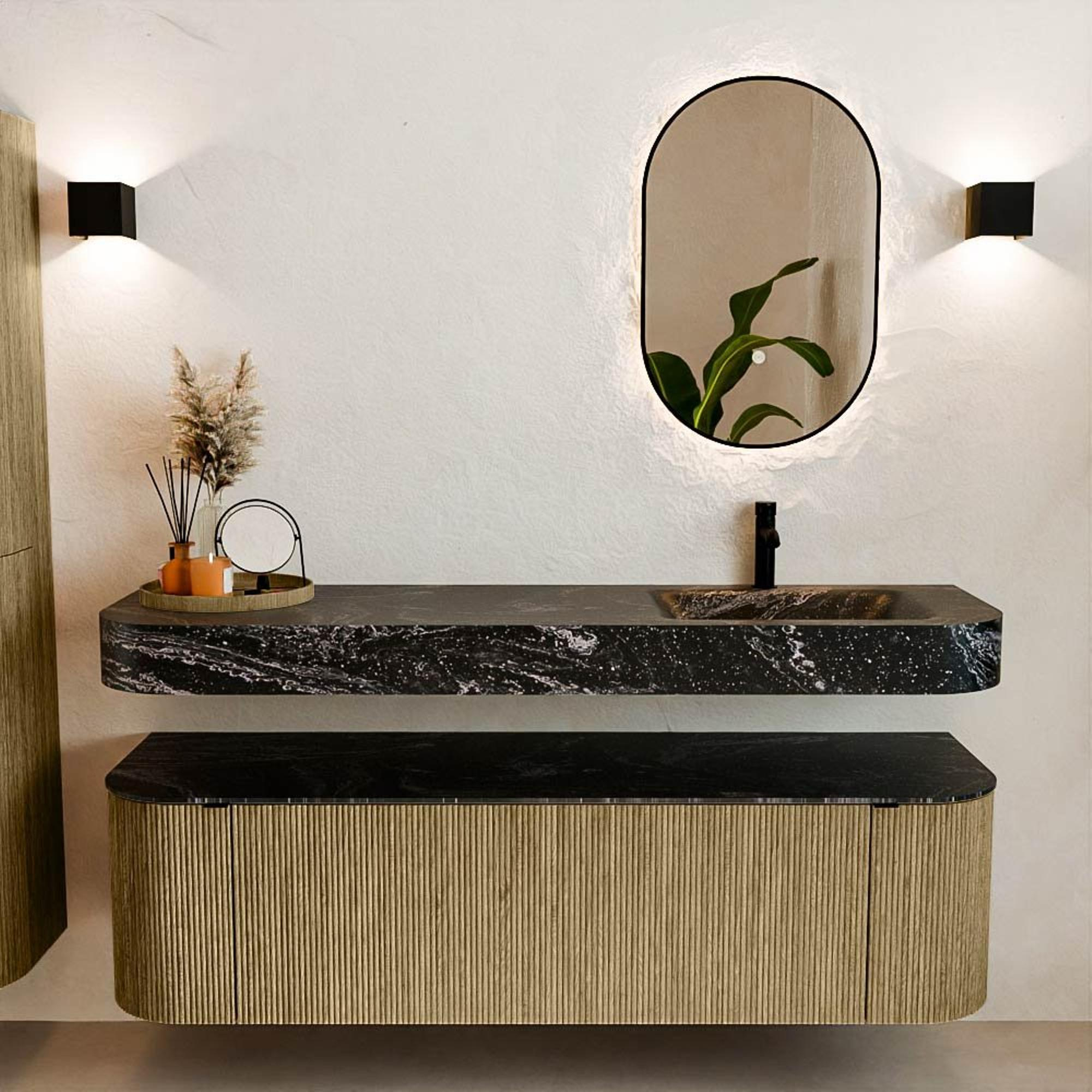 Matériaux naturels dans des tons chauds. Les rainures verticales apportent rythme et texture au design, tandis que le chêne confère une apparence chaleureuse et artisanale. Choisissez parmi 5 teintes de bois OAK, WALNUT, DUSK, SHADOW et RUBY, des couleurs de bois soigneusement sélectionnées pour enrichir les salles de bains modernes et classiques.