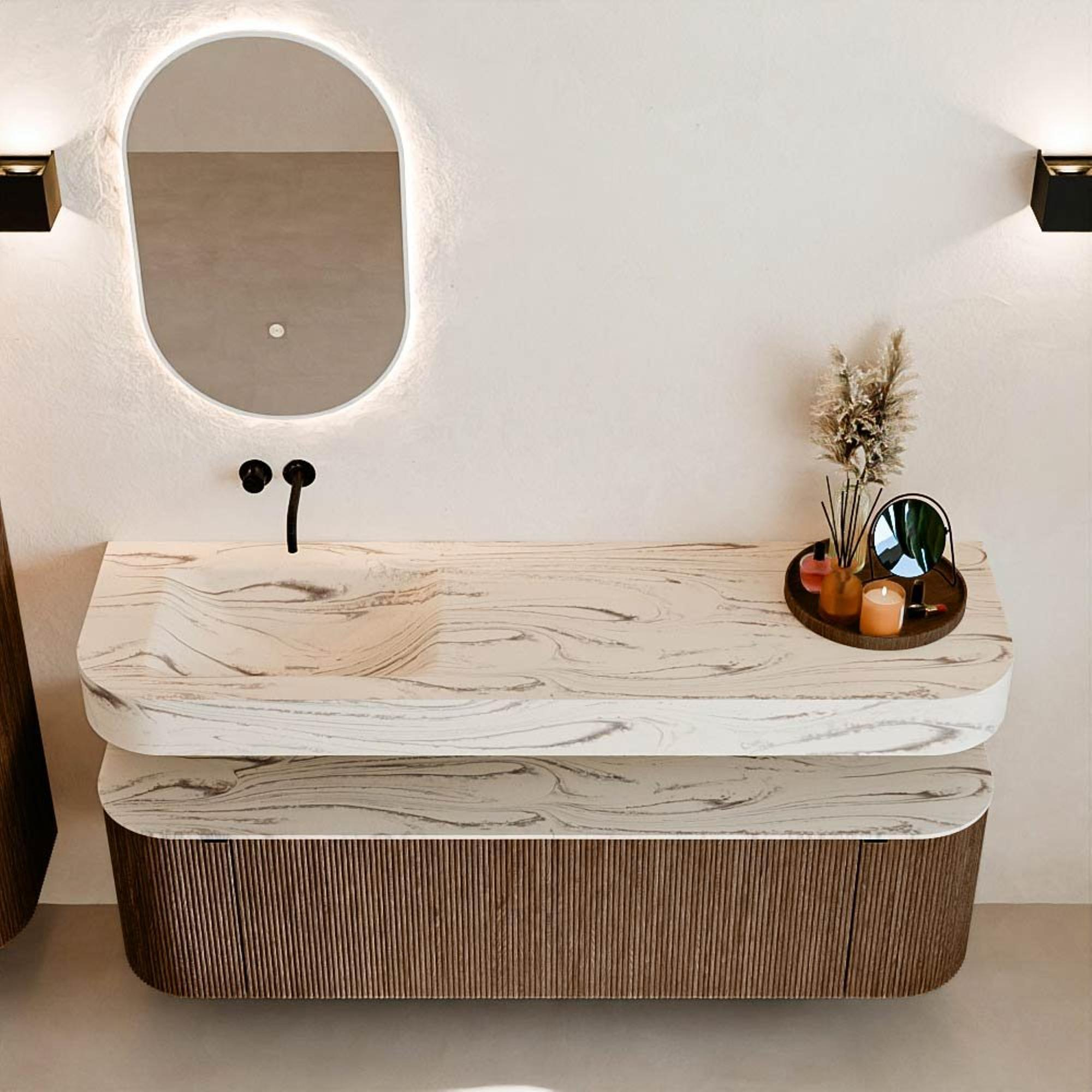 Au-dessus du meuble flotte une vasque suspendue assortie aux coins arrondis – parfaitement adaptée à la forme du meuble. La vasque est réalisée en Solid Surface et suit subtilement les lignes du meuble inférieur, créant ainsi un ensemble harmonieux. Le plan de travail en Solid Surface forme une base solide, facile d'entretien, et complète la combinaison.