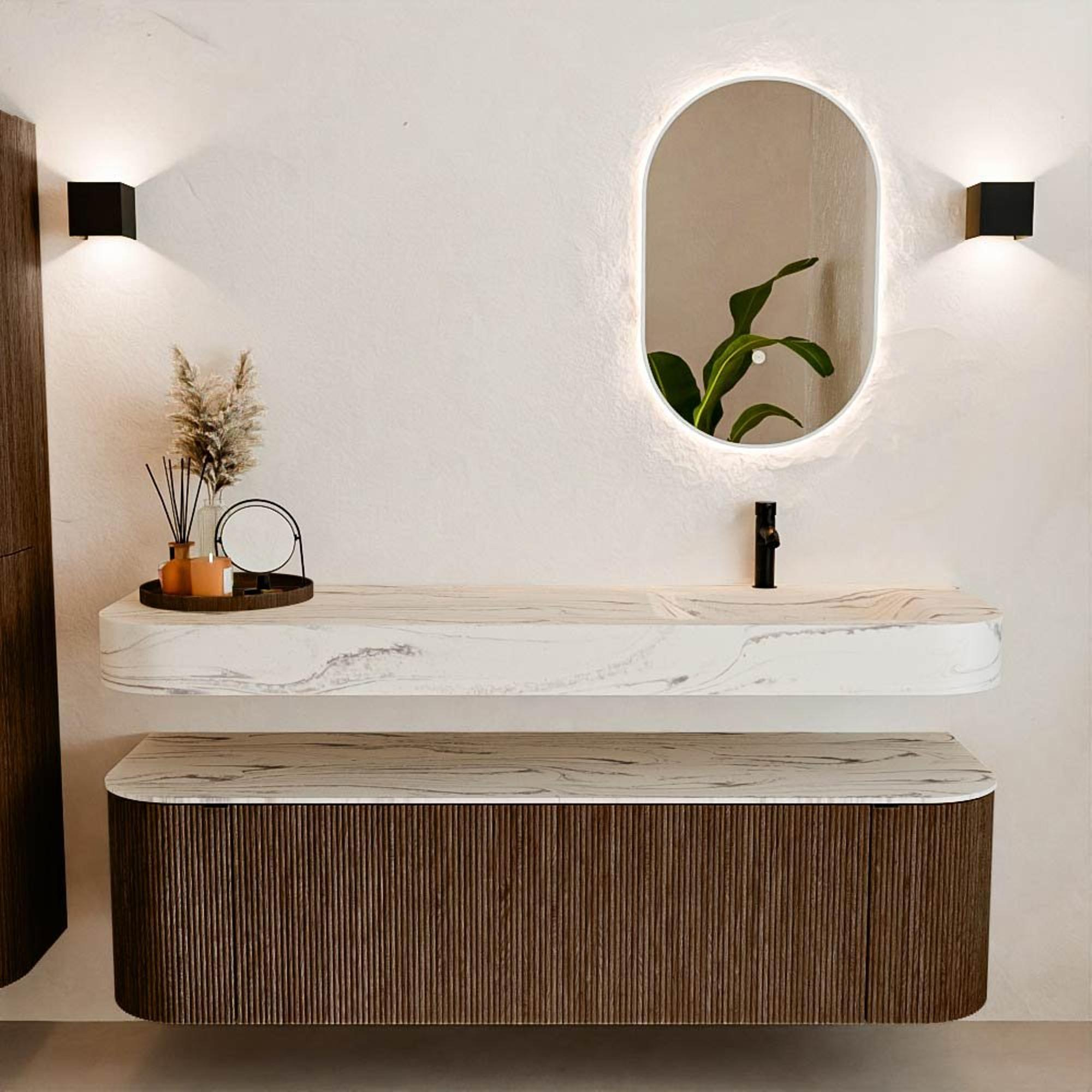 Matériaux naturels dans des tons chauds. Les cannelures verticales apportent rythme et texture au design, tandis que le chêne confère une apparence chaleureuse et artisanale. Choisissez parmi 5 teintes de bois OAK, WALNUT, DUSK, SHADOW et RUBY, des couleurs de bois soigneusement sélectionnées pour enrichir les salles de bains modernes et classiques.
