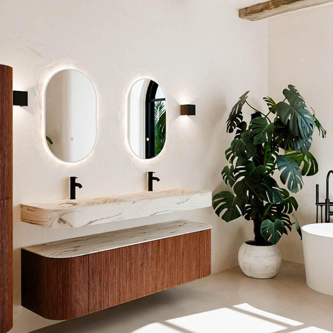Matériaux naturels dans des tons chauds. Les nervures verticales apportent rythme et texture au design, tandis que le chêne confère une apparence chaleureuse et artisanale. Choisissez parmi 5 teintes de bois OAK, WALNUT, DUSK, SHADOW et RUBY, des couleurs de bois soigneusement sélectionnées pour enrichir les salles de bains modernes et classiques.