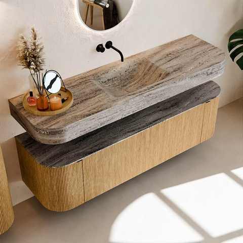Matériaux naturels dans des tons chauds. Les cannelures verticales apportent rythme et texture au design, tandis que le chêne confère une apparence chaleureuse et artisanale. Choisissez parmi 5 teintes de bois OAK, WALNUT, DUSK, SHADOW et RUBY, des couleurs de bois soigneusement sélectionnées pour enrichir les salles de bains modernes et classiques.