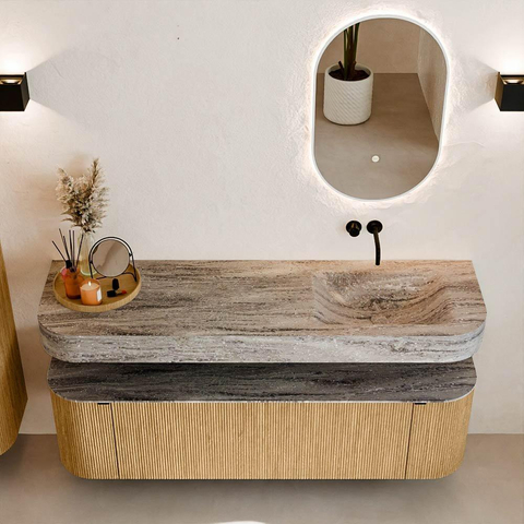 MONDIAZ THOR-DLUX 160cm meuble de salle de bains arrondi gauche + droite couleur Chêne avec 1 tiroir et 2 portes. Vasque suspendue CLOUD droite sans trou de robinet couleur Oza.