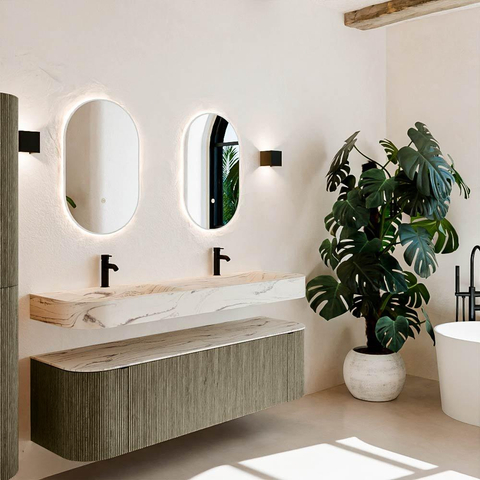 Matériaux naturels dans des tons chauds. Les nervures verticales apportent rythme et texture au design, tandis que le chêne confère une apparence chaleureuse et artisanale. Choisissez parmi 5 teintes de bois OAK, WALNUT, DUSK, SHADOW et RUBY, des couleurs de bois soigneusement sélectionnées pour enrichir les salles de bains modernes et classiques.