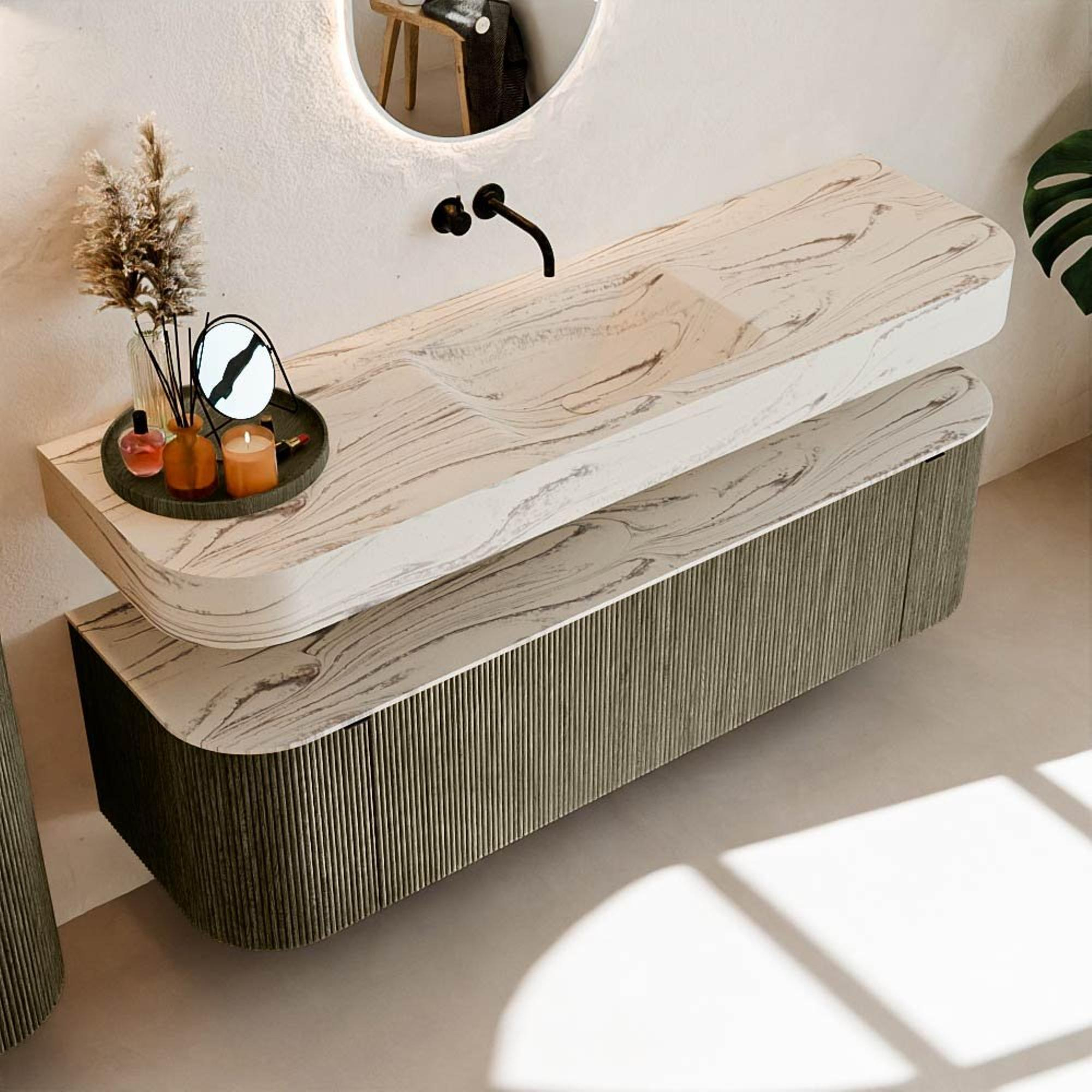 Au-dessus du meuble flotte une vasque suspendue assortie aux coins arrondis – parfaitement adaptée à la forme du meuble. La vasque est en Solid Surface et suit subtilement les lignes du meuble inférieur, créant ainsi un ensemble harmonieux. Le plan de travail en Solid Surface constitue une base solide et facile d'entretien et complète la combinaison.
