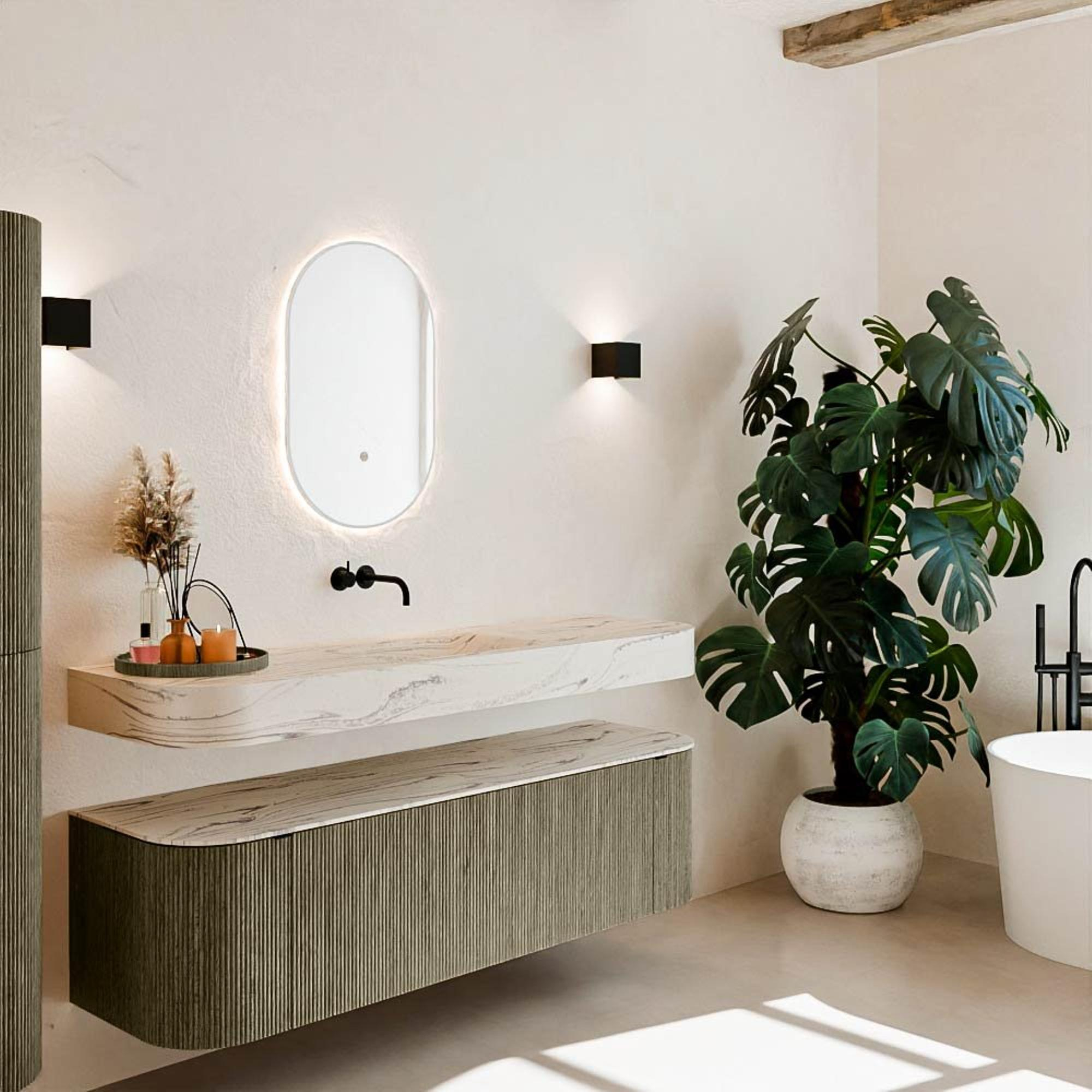 Matériaux naturels dans des tons chauds. Les nervures verticales apportent rythme et texture au design, tandis que le chêne confère une apparence chaleureuse et artisanale. Choisissez parmi 5 teintes de bois OAK, WALNUT, DUSK, SHADOW et RUBY, des couleurs de bois soigneusement sélectionnées pour enrichir les salles de bains modernes et classiques.