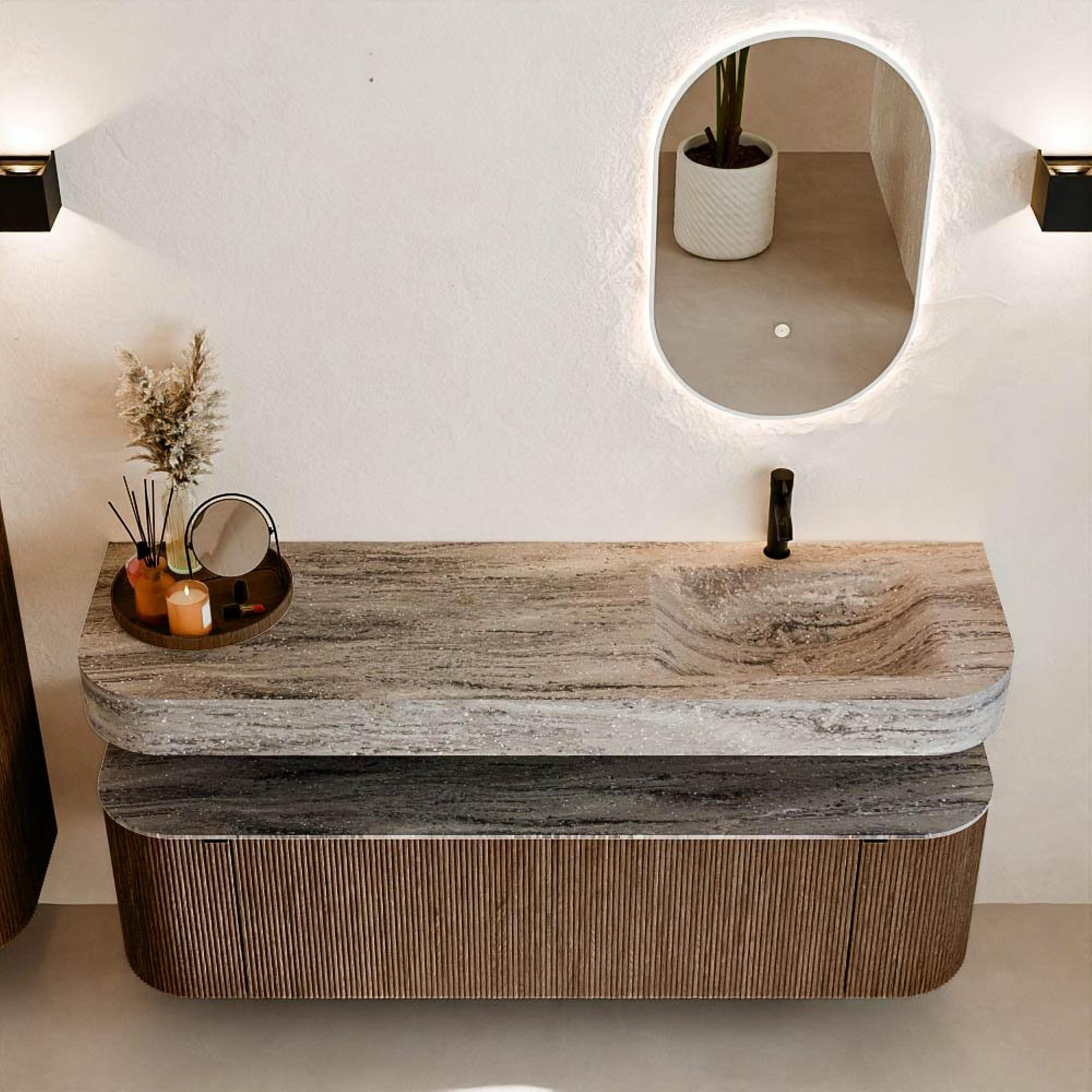 Matériaux naturels dans des tons chauds. Les nervures verticales apportent rythme et texture au design, tandis que le chêne confère une apparence chaleureuse et artisanale. Choisissez parmi 5 teintes de bois OAK, WALNUT, DUSK, SHADOW et RUBY, des couleurs de bois soigneusement sélectionnées pour enrichir les salles de bains modernes et classiques.