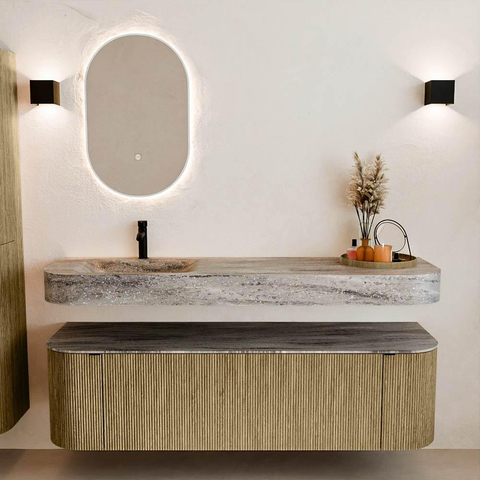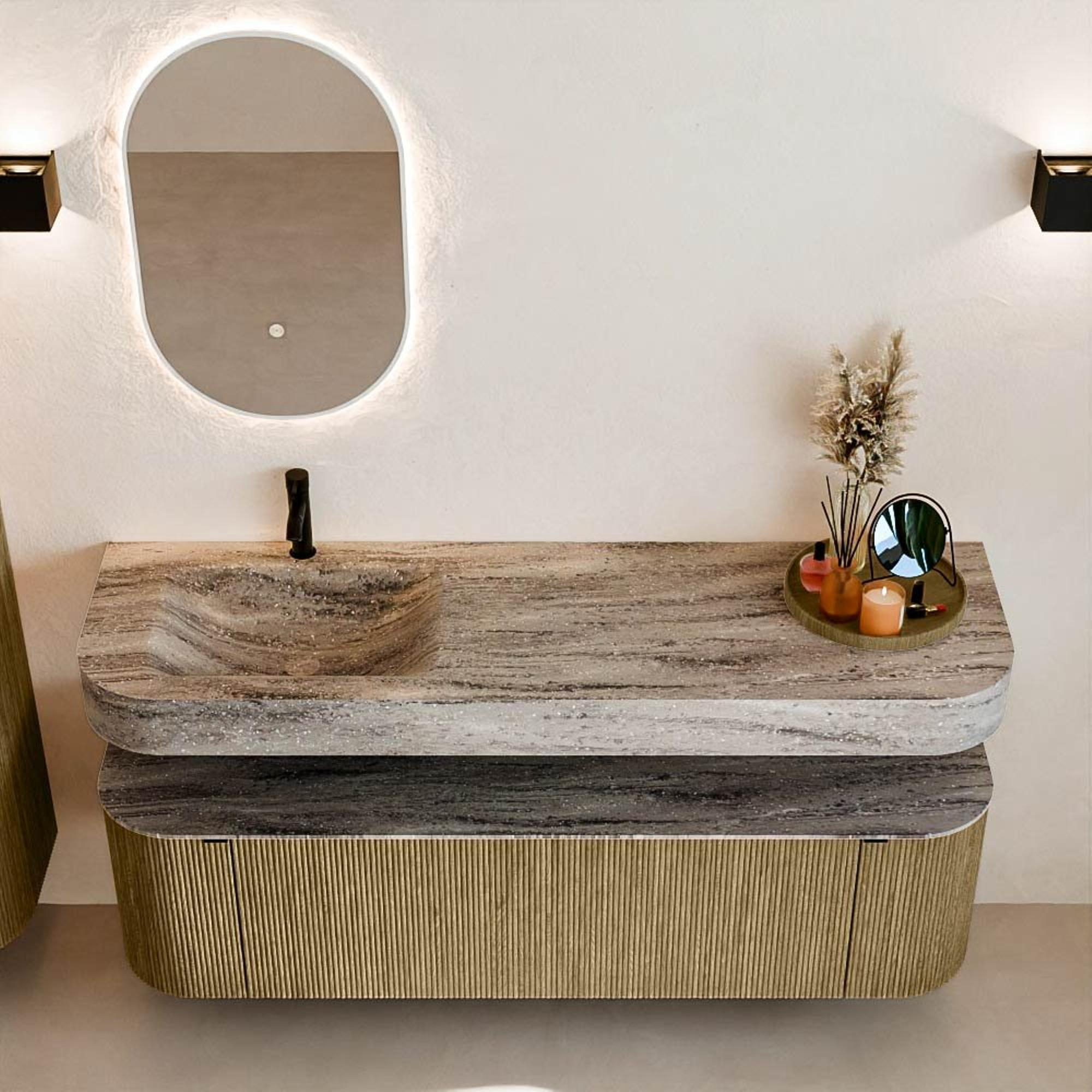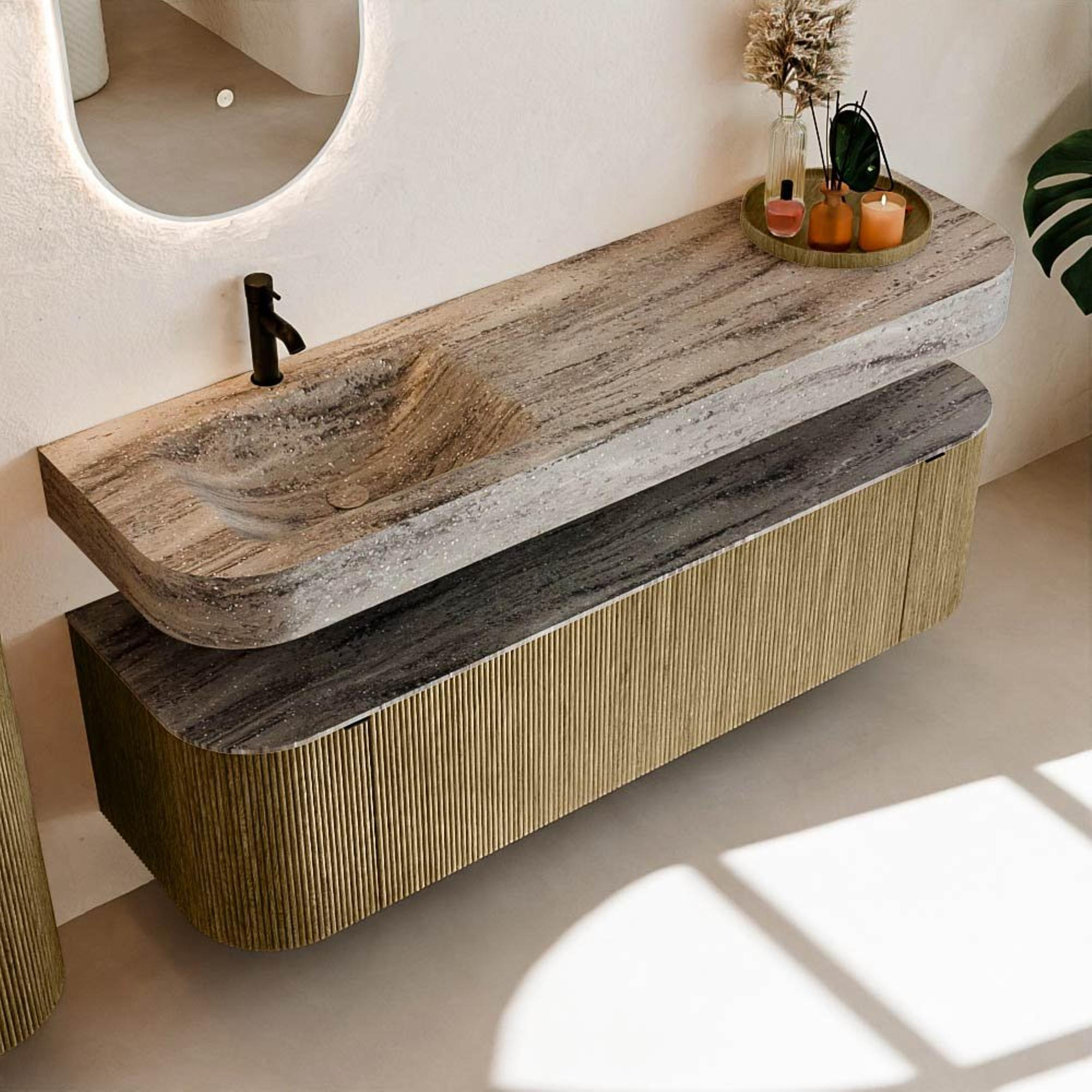 Matériaux naturels dans des tons chauds. Les nervures verticales apportent rythme et texture au design, tandis que le chêne confère une apparence chaleureuse et artisanale. Choisissez parmi 5 teintes de bois OAK, WALNUT, DUSK, SHADOW et RUBY, des couleurs de bois soigneusement sélectionnées pour enrichir les salles de bains modernes et classiques.