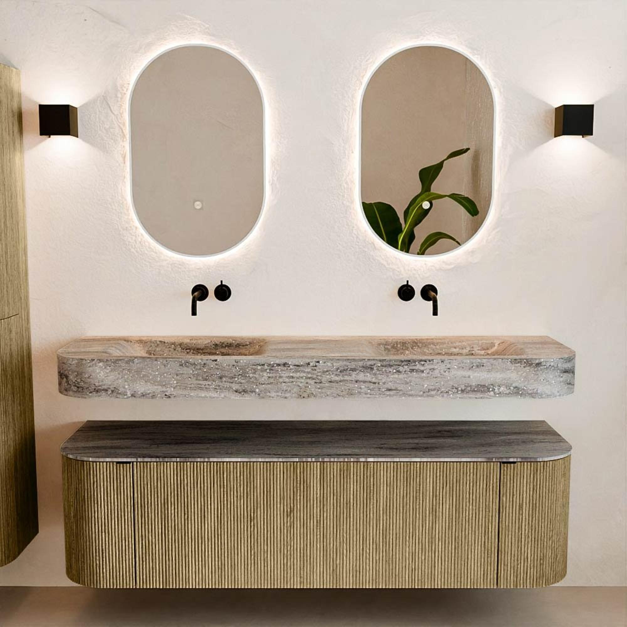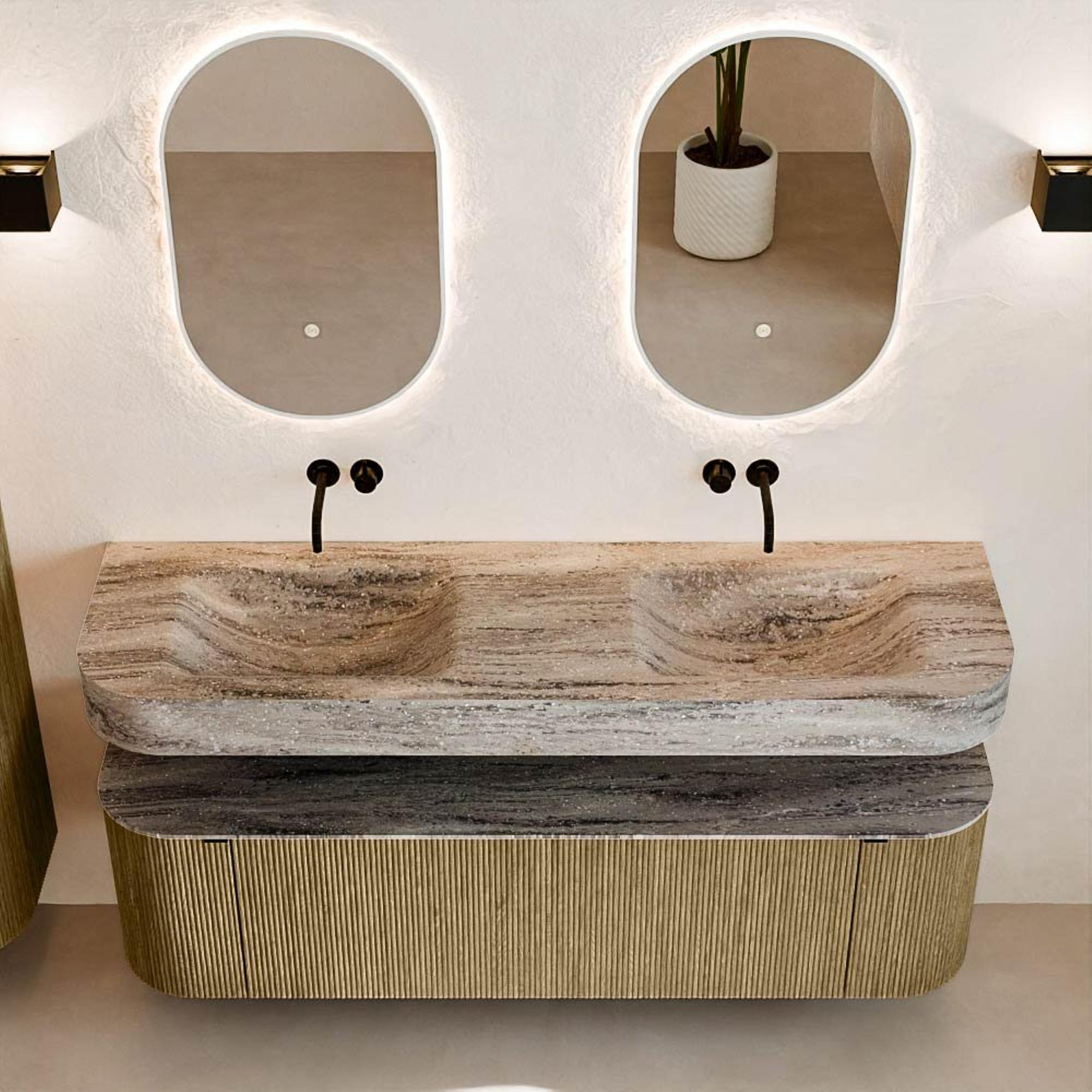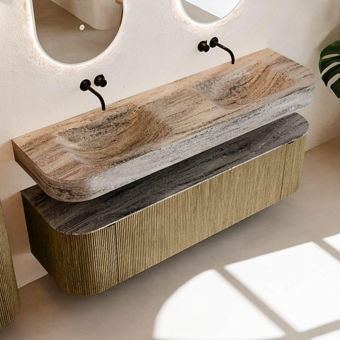 Matériaux naturels dans des tons chauds. Les cannelures verticales apportent rythme et texture au design, tandis que le chêne confère une apparence chaleureuse et artisanale. Choisissez parmi 5 teintes de bois OAK, WALNUT, DUSK, SHADOW et RUBY, des couleurs de bois soigneusement sélectionnées pour enrichir les salles de bains modernes et classiques.