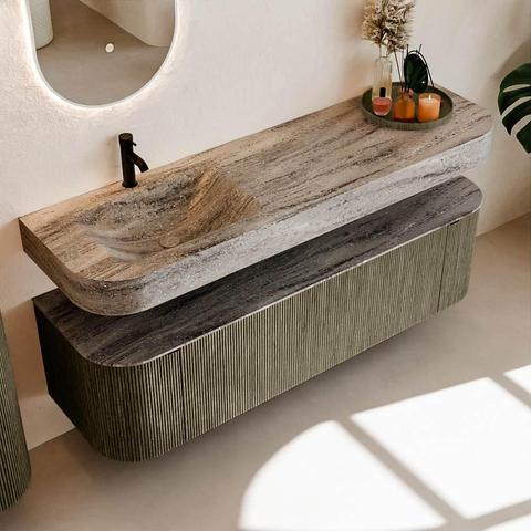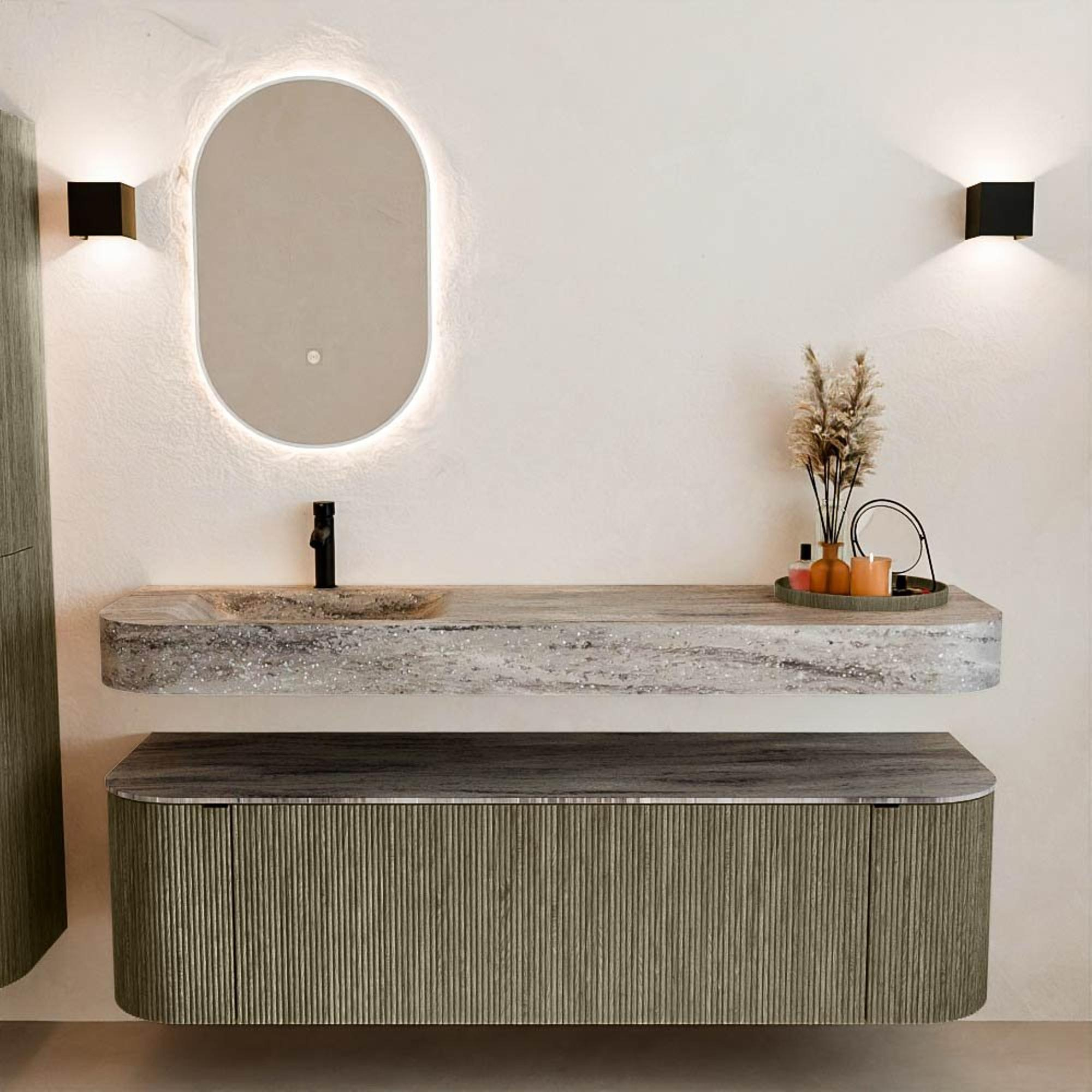 Matériaux naturels dans des tons chauds. Les nervures verticales apportent rythme et texture au design, tandis que le chêne confère une apparence chaleureuse et artisanale. Choisissez parmi 5 teintes de bois OAK, WALNUT, DUSK, SHADOW et RUBY, des couleurs de bois soigneusement sélectionnées pour enrichir les salles de bains modernes et classiques.