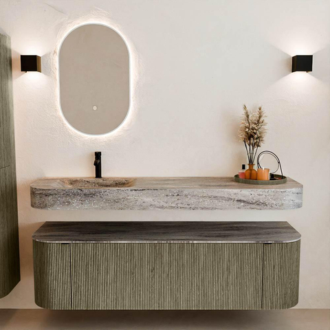 MONDIAZ THOR-DLUX 160cm meuble de salle de bains arrondi gauche + droite couleur Shadow avec 1 tiroir et 2 portes. Vasque suspendue CLOUD Gauche 1 trou de robinet couleur Oza.