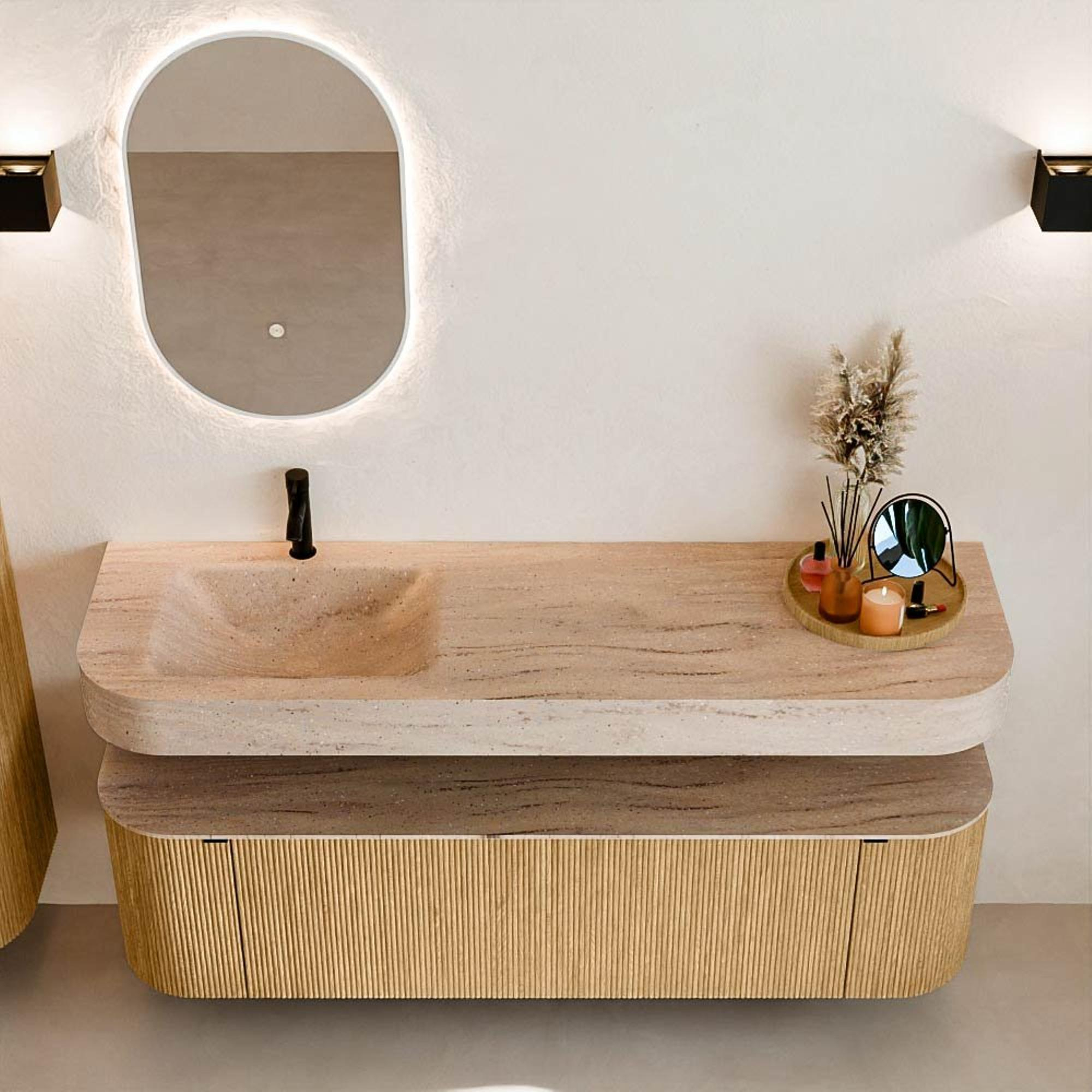 Au-dessus du meuble flotte une vasque suspendue assortie aux coins arrondis – parfaitement adaptée à la forme du meuble. La vasque est réalisée en Solid Surface et suit subtilement les lignes du meuble inférieur, créant ainsi un ensemble harmonieux. Le plan de travail en Solid Surface forme une base solide et facile d'entretien et complète la combinaison.